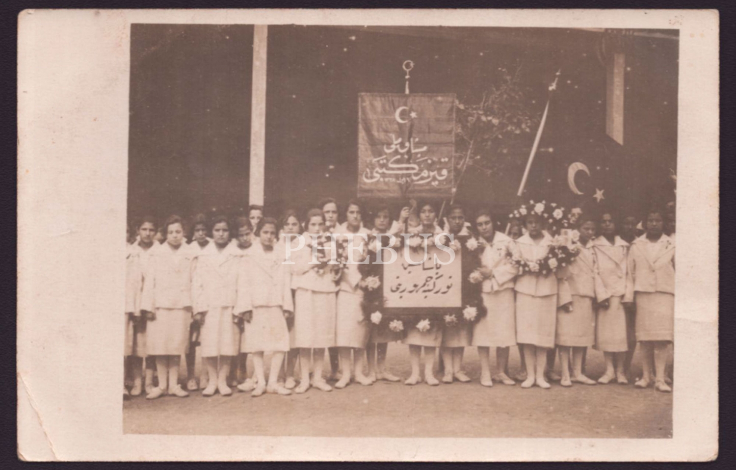 Misak-ı Milli Kız Mektebi öğrencilerinin "Yaşasın Türkiye Cumhuriyeti" yazılı pankartla aldırdıkları hatıra fotoğrafı, 14x9 cm...