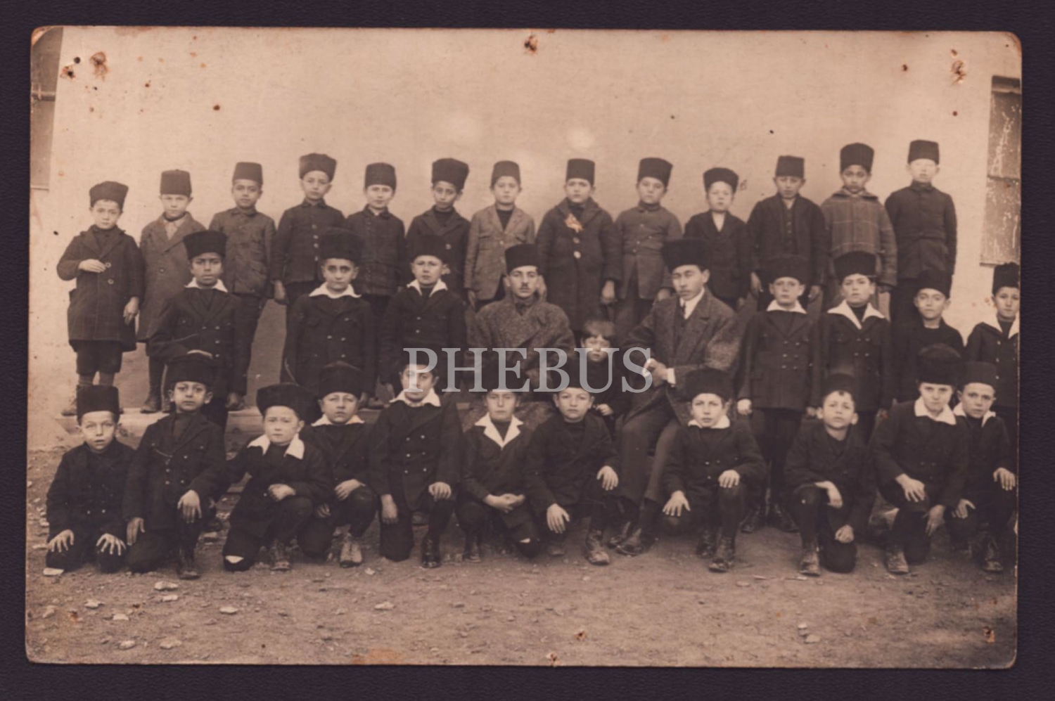 Fesli ve kalpaklı minik öğrencilerin öğretmenleriyle aldırdıkları toplu hatıra fotoğrafı, 14x9 cm...