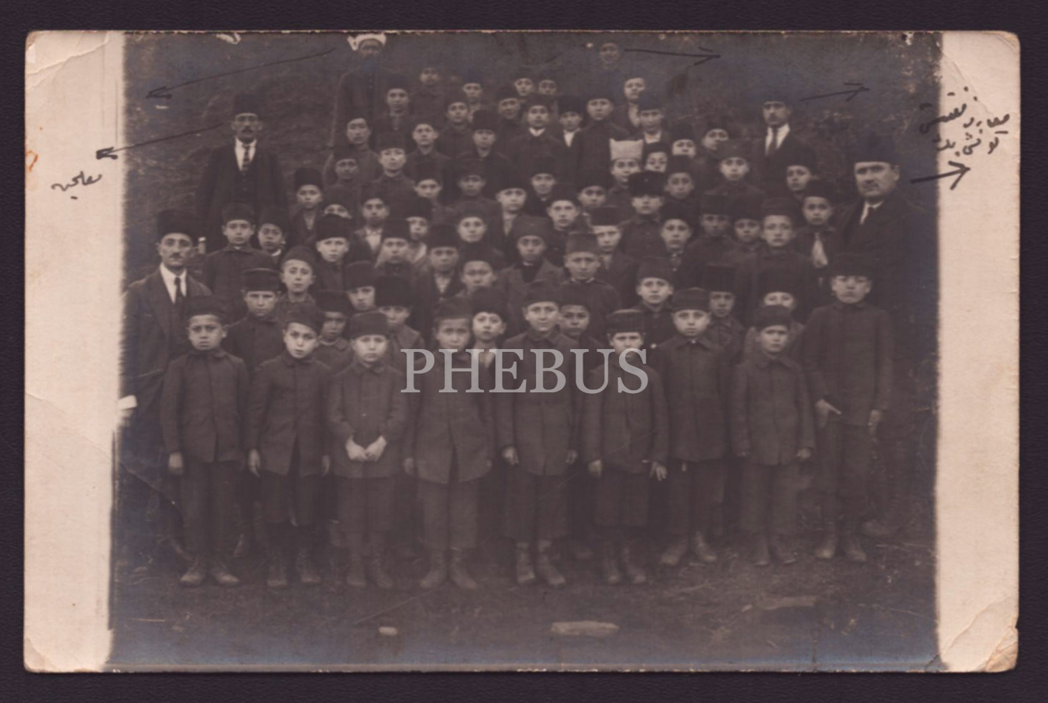 Fesli öğrencilerin öğretmenleri ve Maarif Müfettişi Güneş Bey ile aldırdıkları hatıra fotoğrafı, 14x9 cm...