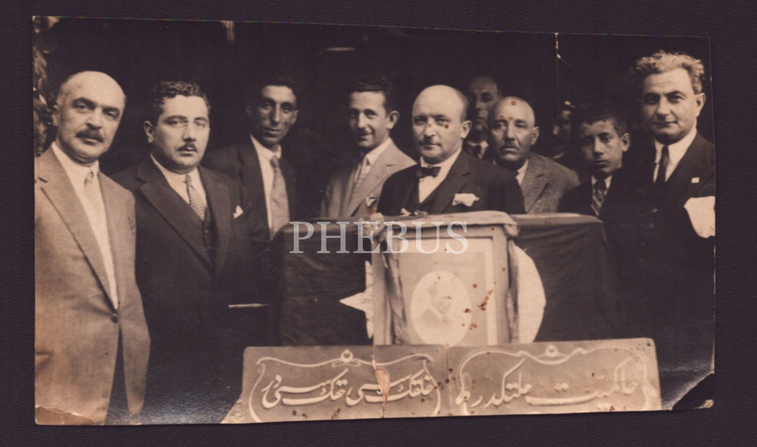 Mustafa Kemal Atatürk fotoğrafı ve "Hakimiyet milletindir; Halkın sesi, hakkın sesidir" yazılı kürsü önünde poz veren beyefendilerin hatıra fotoğrafı, 13x8 cm...