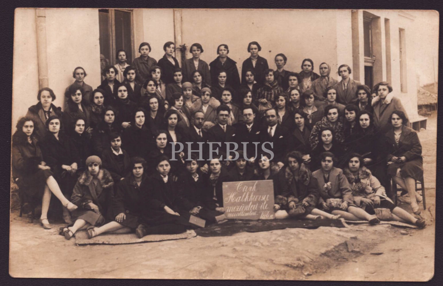"Türk Halk Kursu mezunları ile muallimleri - Vidin" yazılı kartonet önünde toplu hatıra fotoğrafı, 14x9 cm...