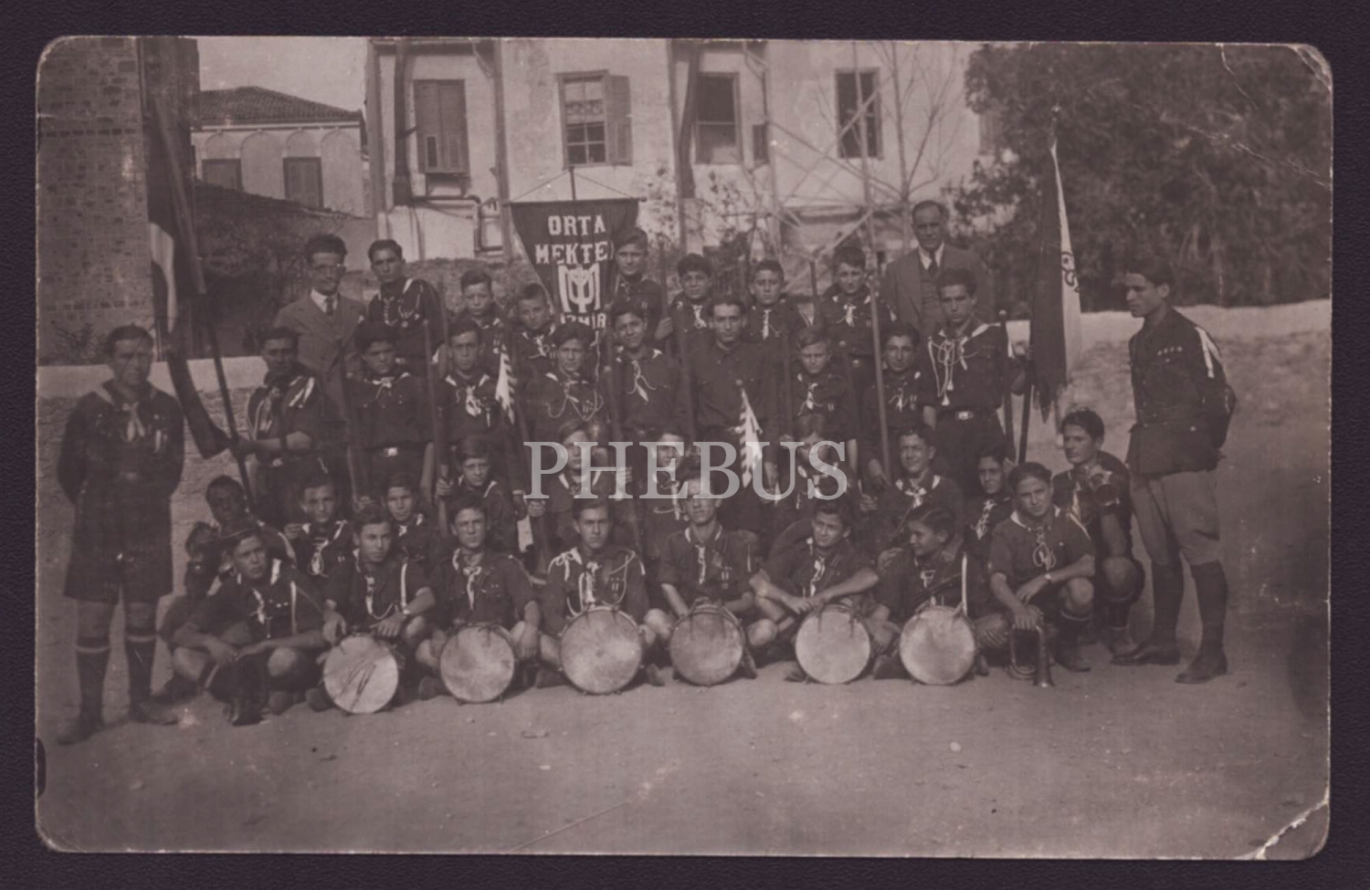 Okul flamalarıyla toplu hatıra fotoğrafı çektiren İzmir Orta Mektep izci takımı, 14x9 cm...