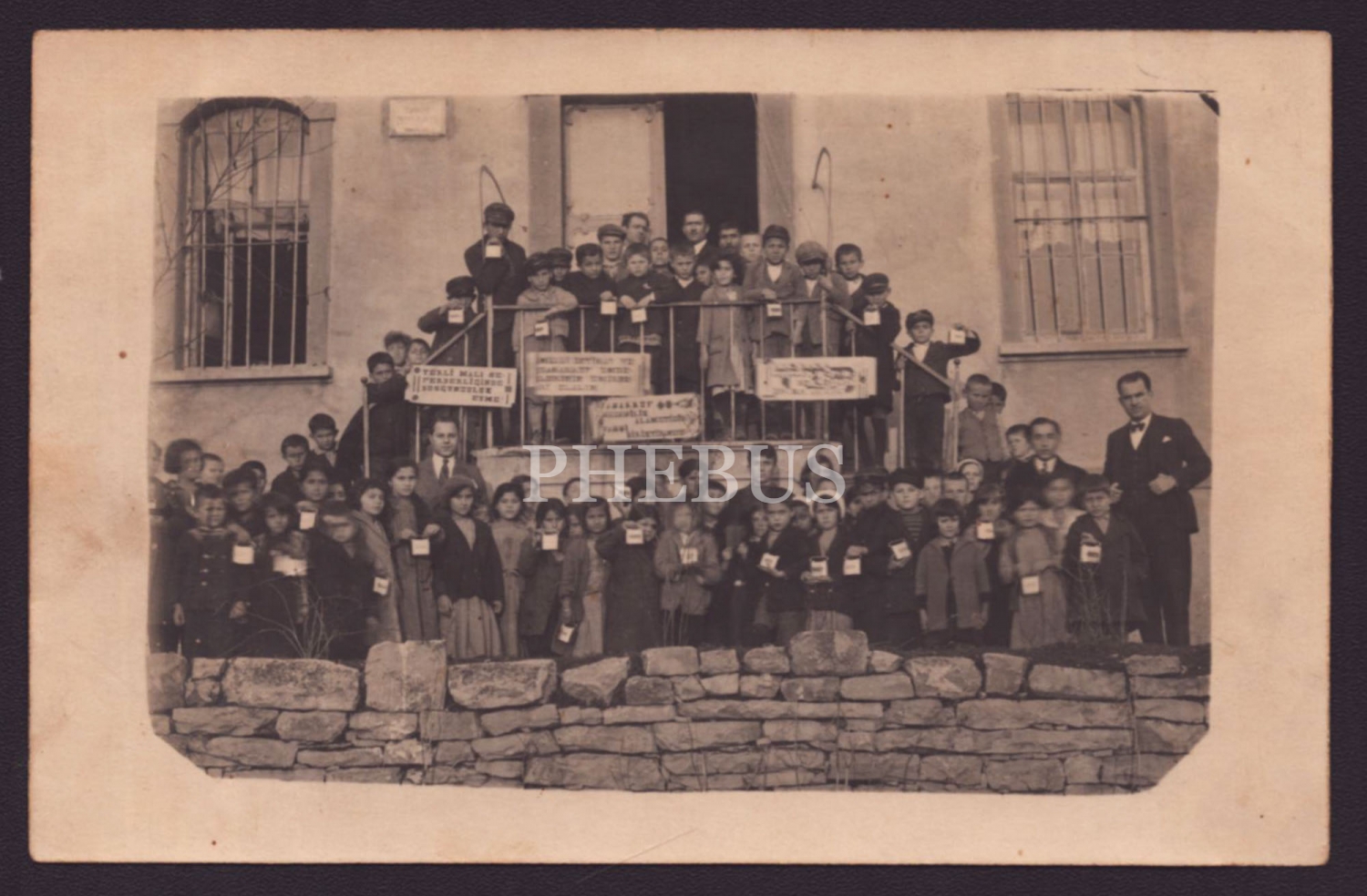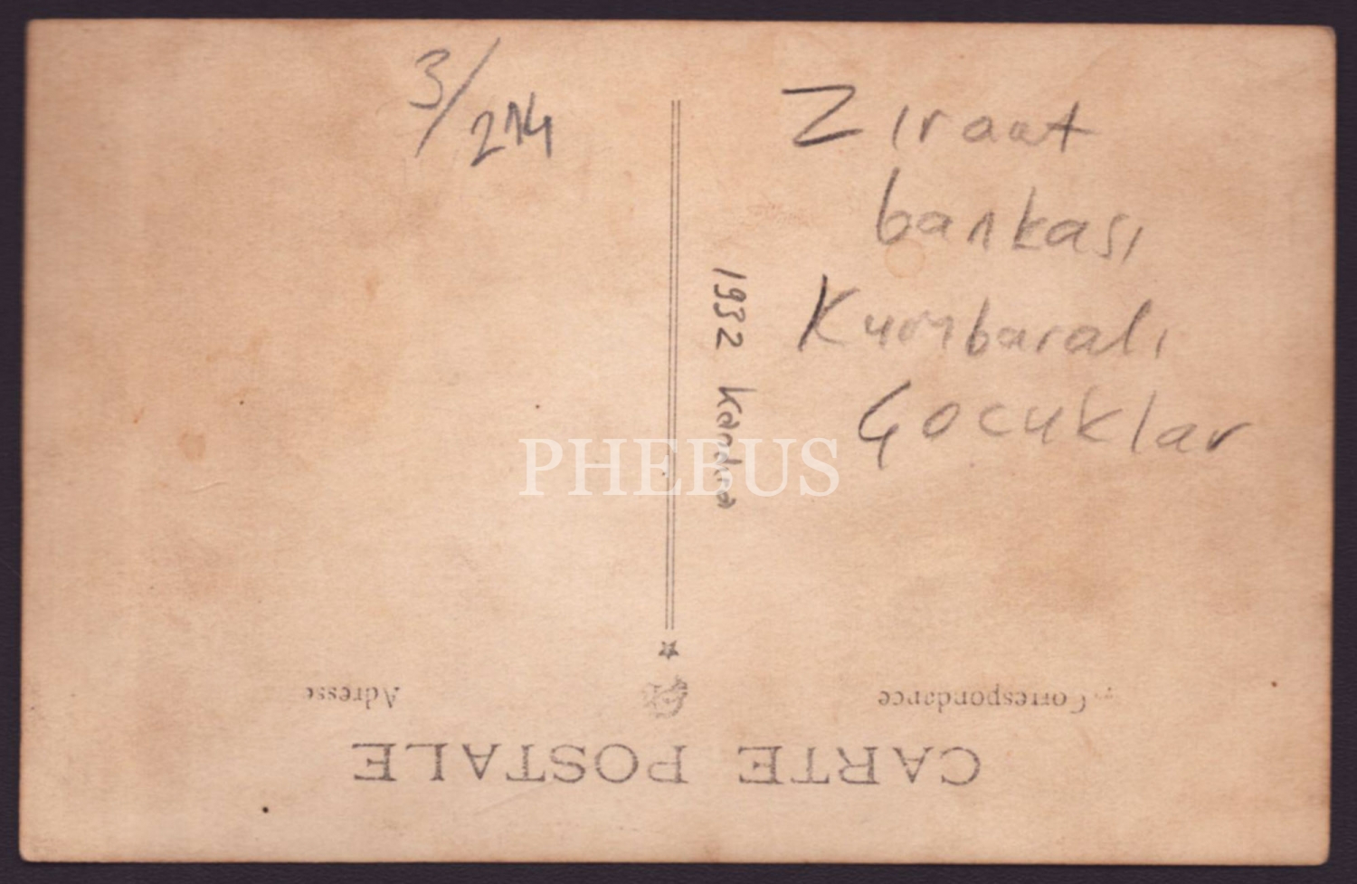 Ellerinde Ziraat Bankası kumbalarıyla poz veren minikler, 1932 tarihli, 14x9 cm...