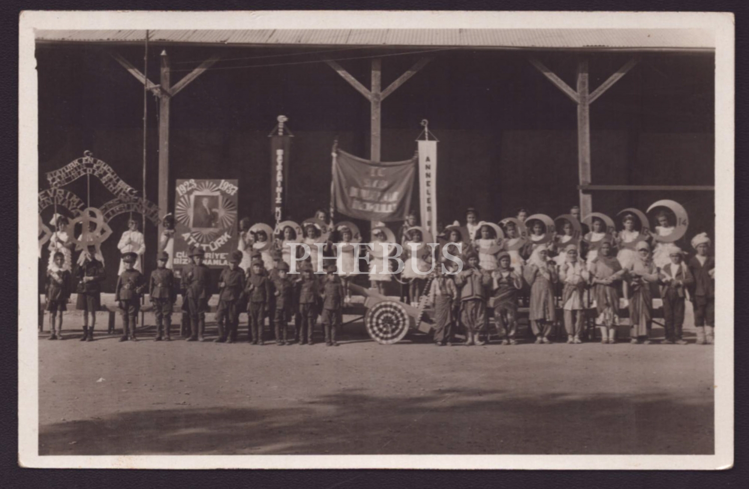 Cumhuriyetin 14. kuruluş yıl dönümünde Mustafa Kemal Atatürk´ü öven çeşitli afiş ve yazılar önünde toplu hatıra fotoğrafı çektiren Dumlupınar İlkokulu öğrencileri, 14x9 cm...