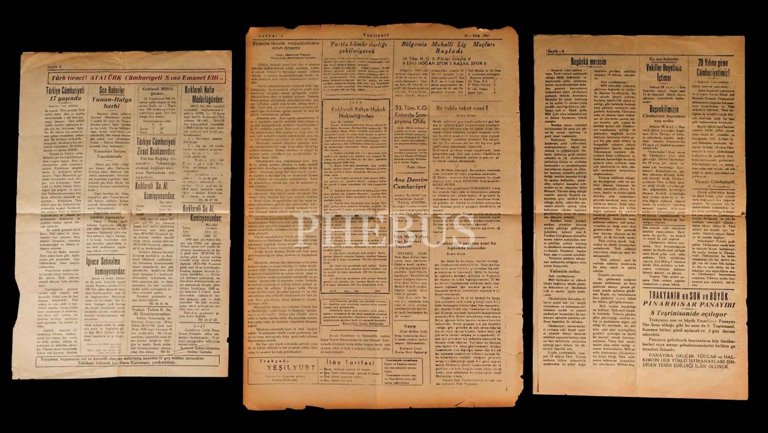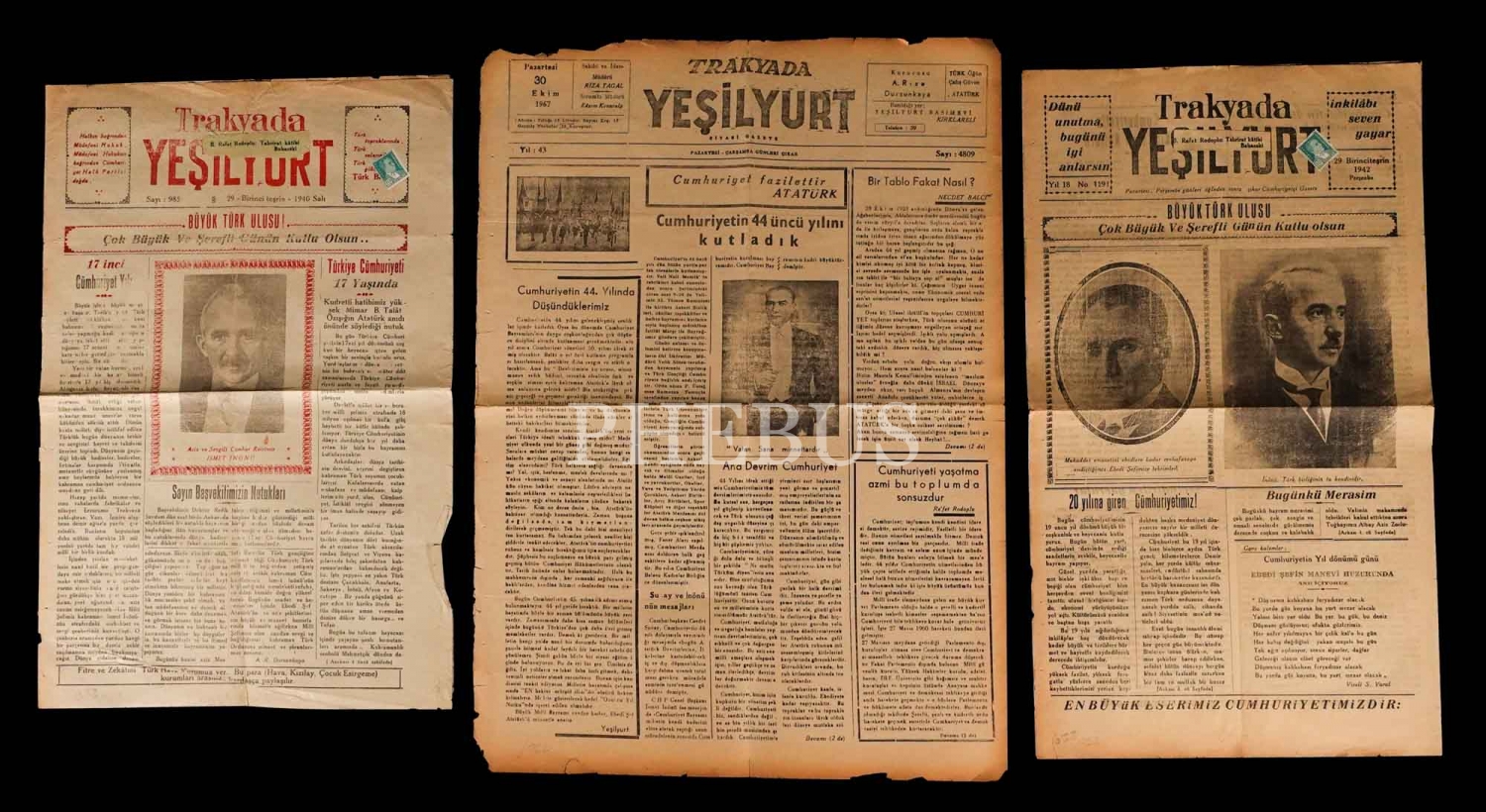 Cumhuriyetin 17., 20. ve 44. kuruluş yıl dönümü konulu üç adet TRAKYADA YEŞİLYURT gazetesi, ortalama 30x51 cm...