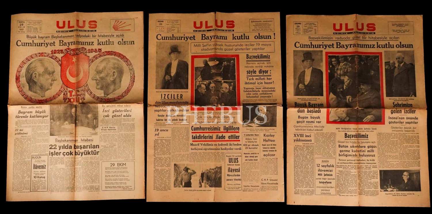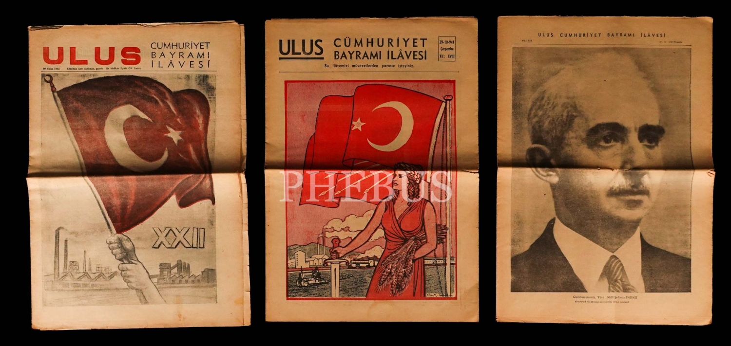 Cumhuriyetin 18., 19. ve 22. kuruluş yıl dönümü konulu üç adet ULUS gazetesi, ortalama 44x60 cm...
