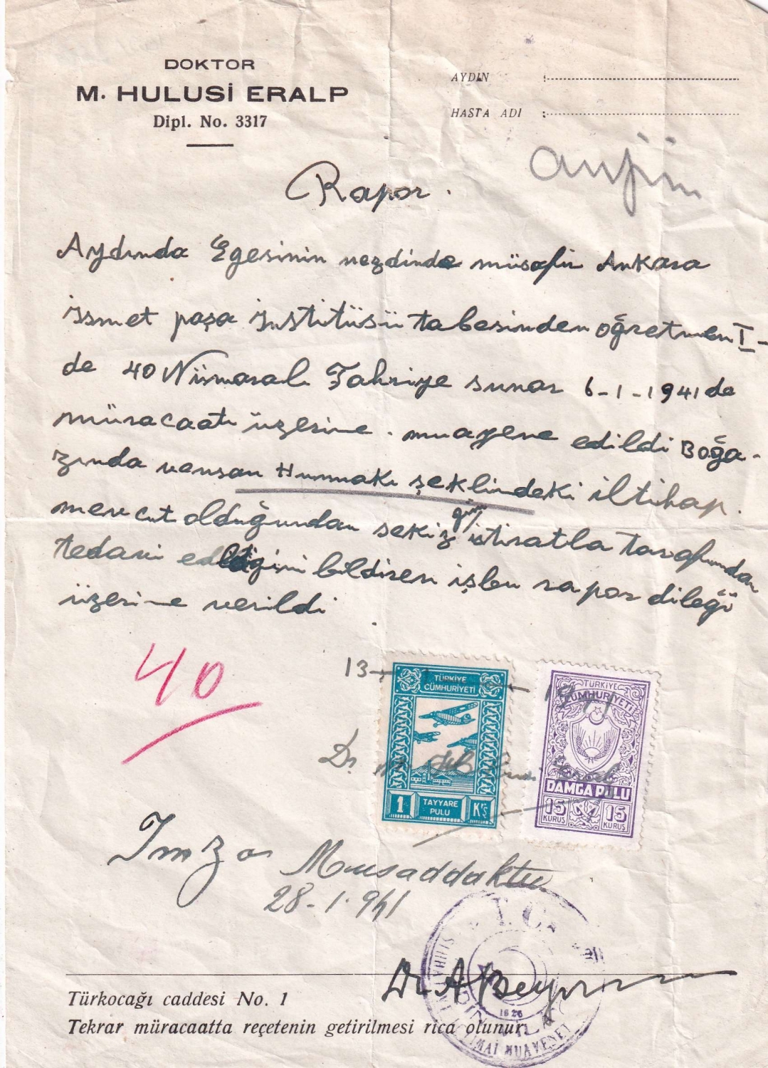 Doktor Hulusi Eralp antetli hasta raporu, 14x20 cm