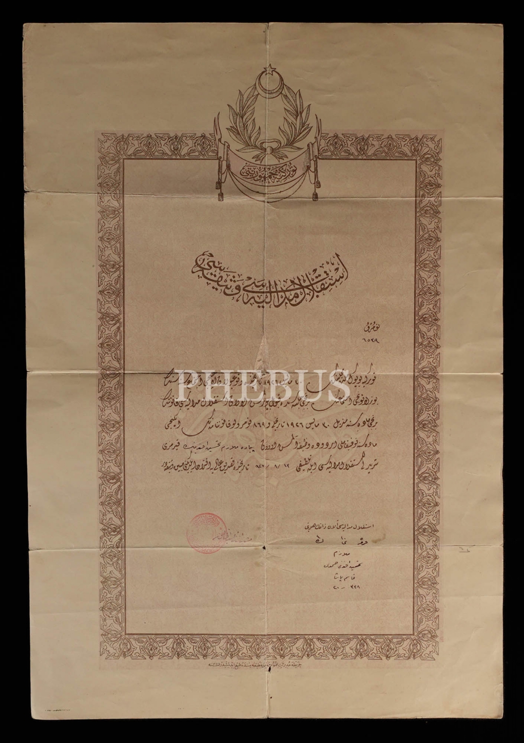 Kasımpaşalı Mülazım Tahsin Efendi´nin kırmızı şeritli İstiklal Madalyası beratı, 12 Ağustos 1927, 34x50 cm...