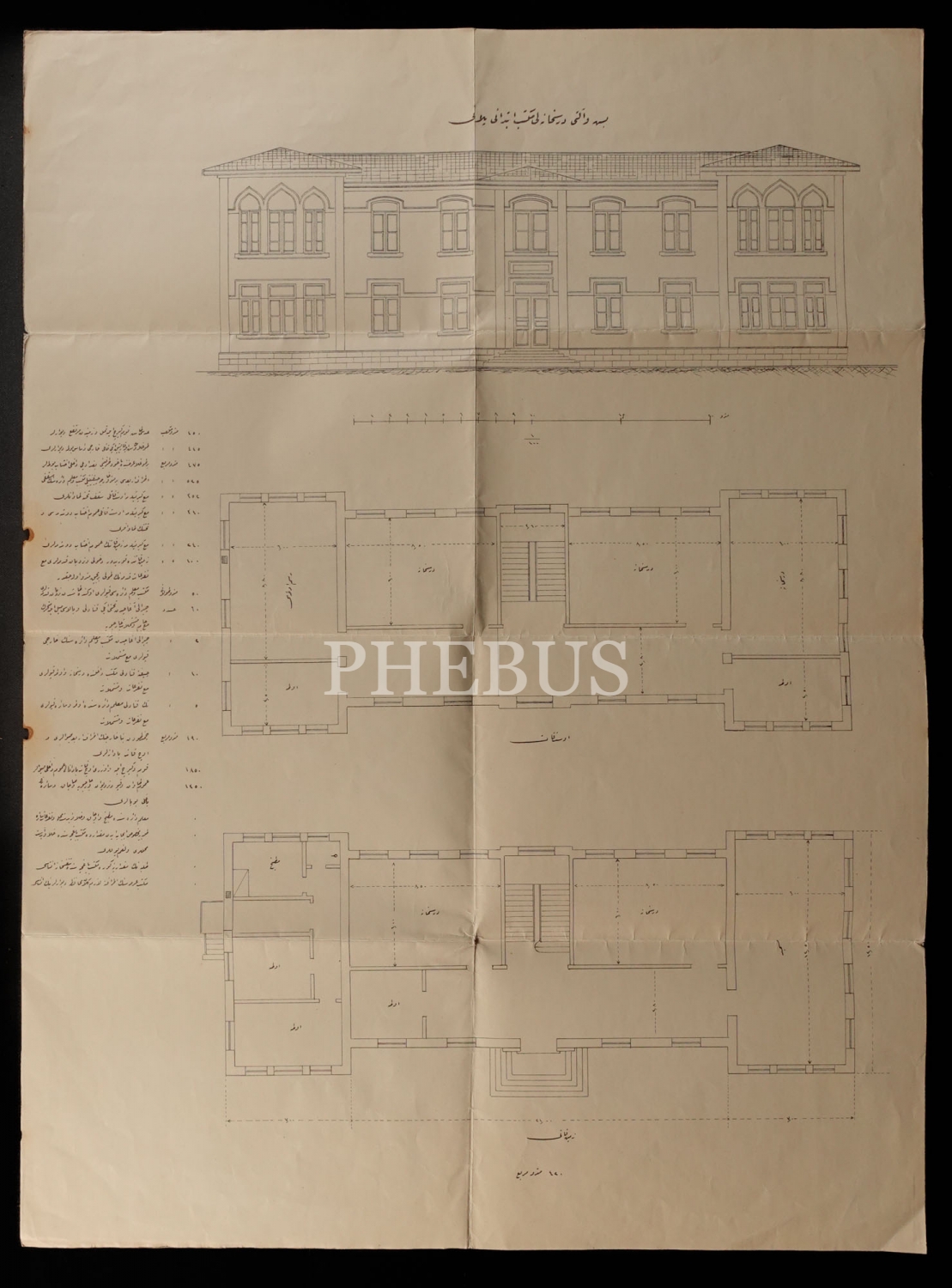 Erken Cumhuriyet döneminde beş ve altı derslikli ilkokulların planını gösteren afiş, "Beş ve Altı Derslikli Mekteb-i İbtida-i Planı", 50x68 cm...