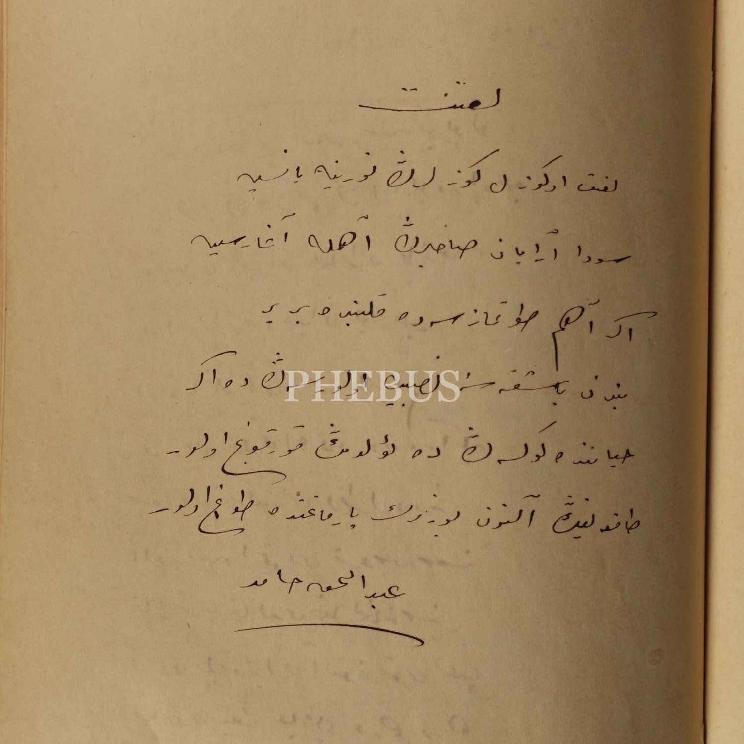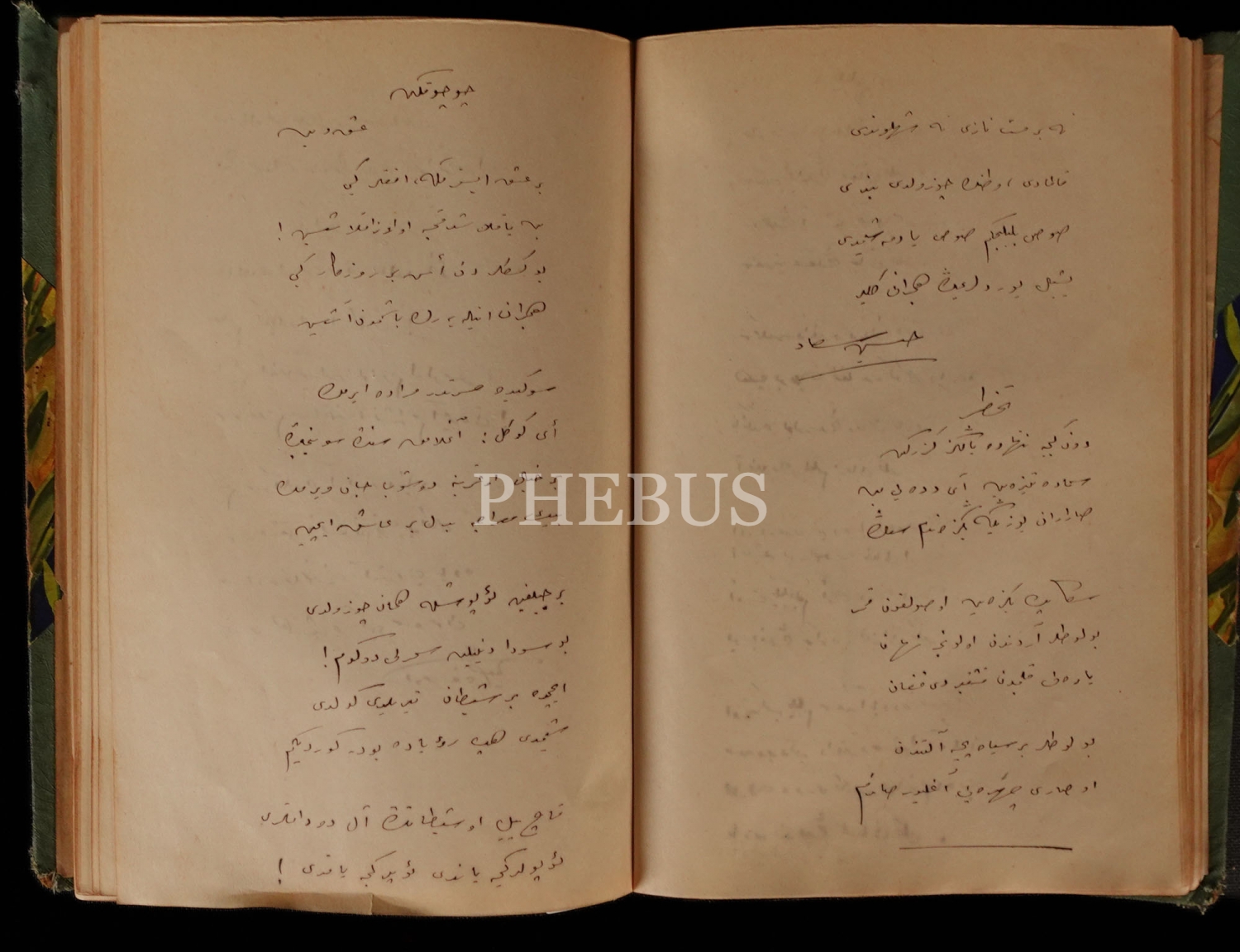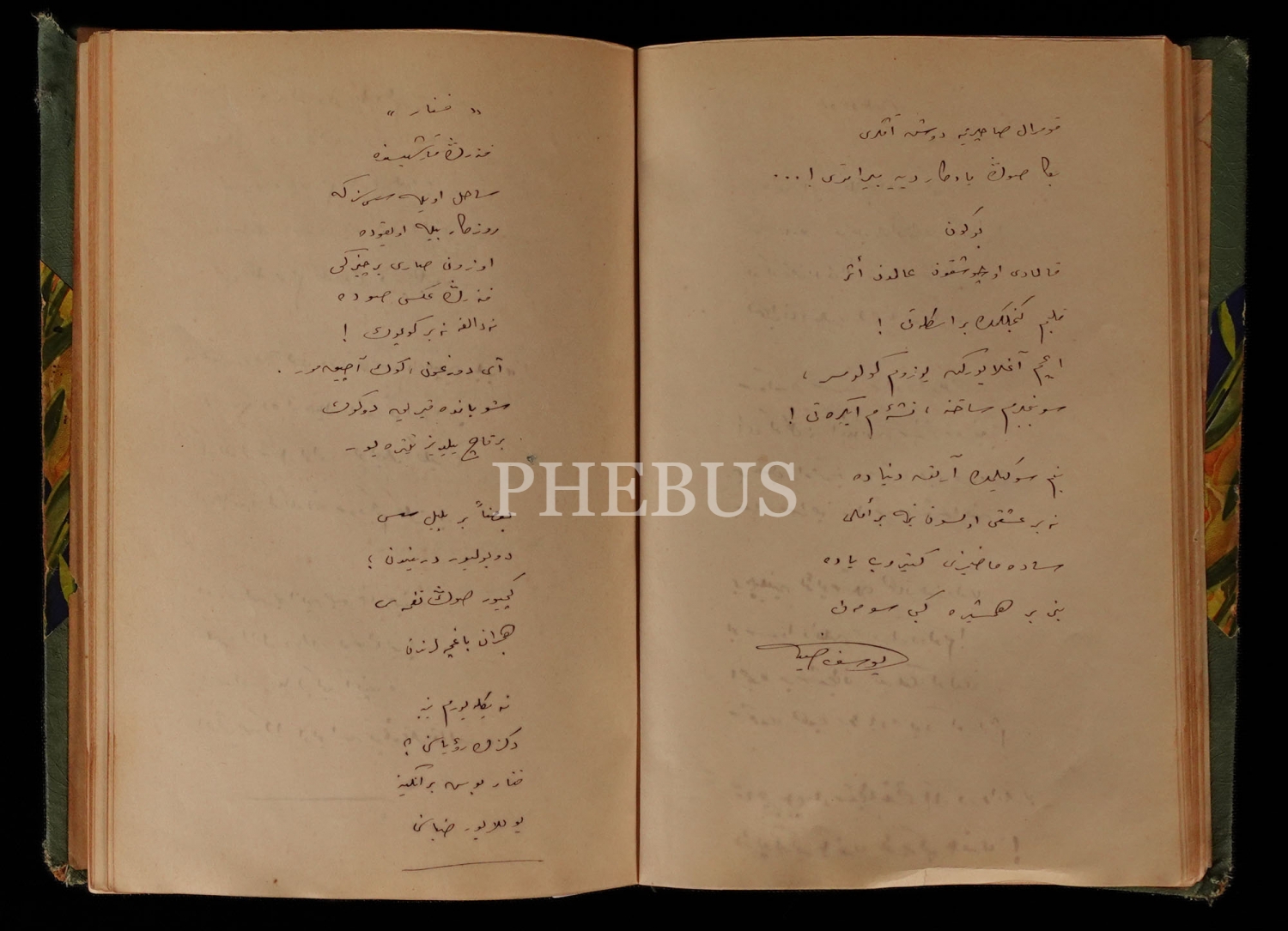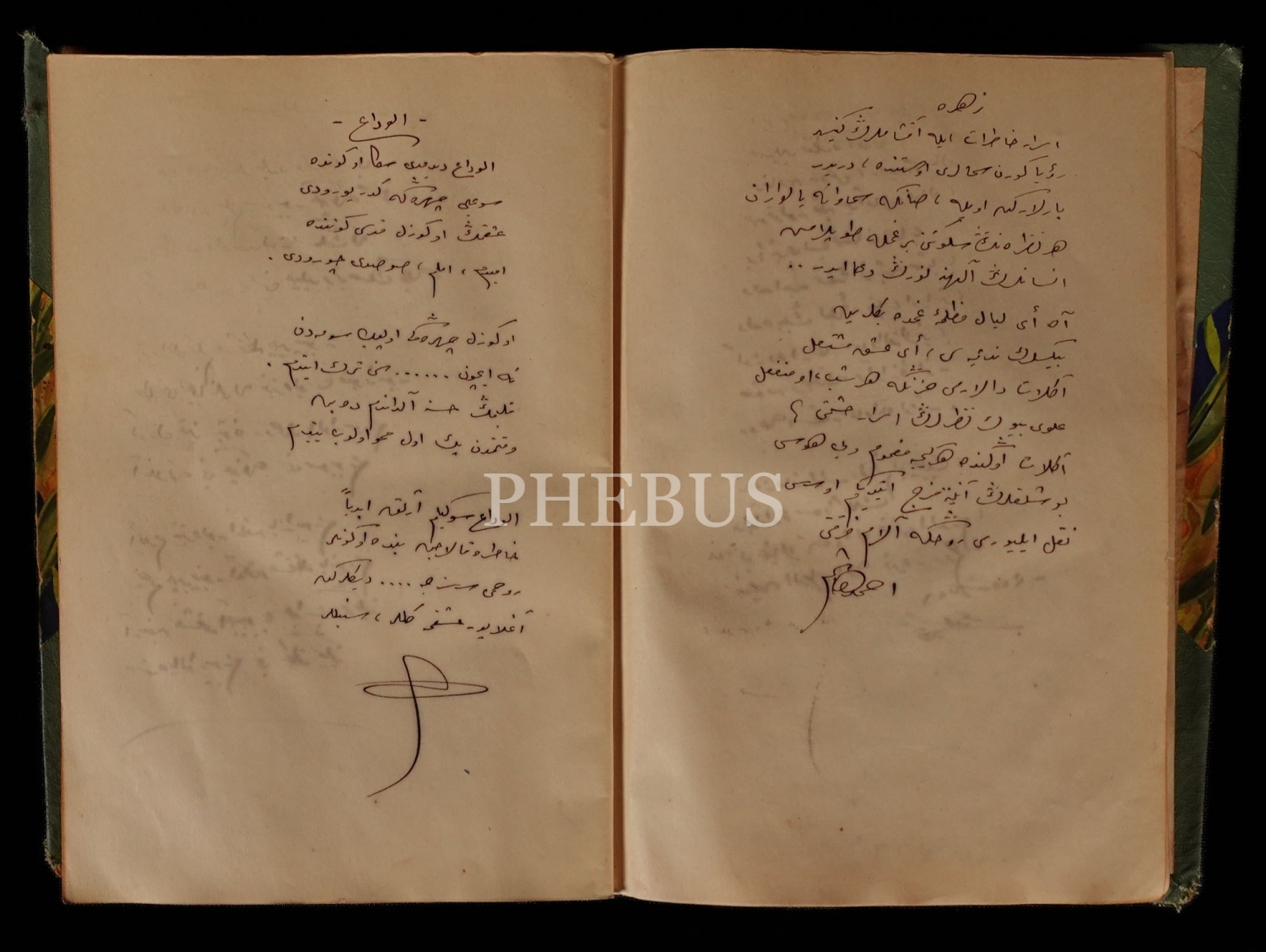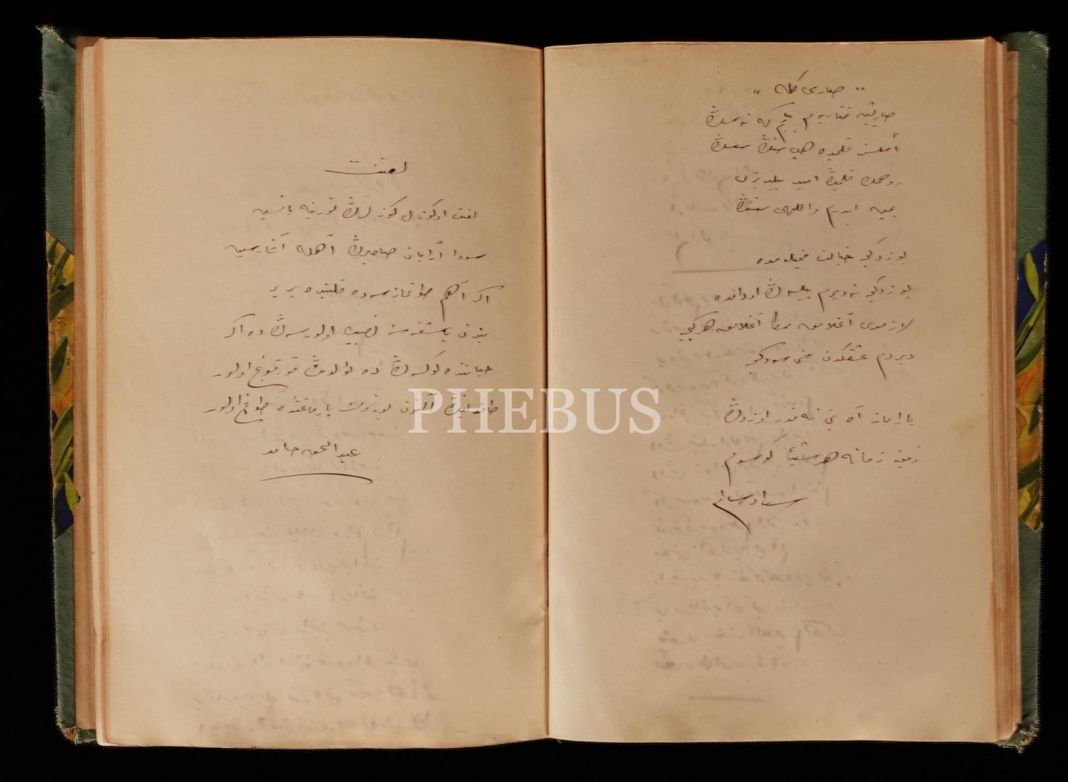 Papağan Mürekkebi İmalathanesi´nin sahibi Meliha Muhlis Hanım´a ait, dönemin ünlü ediplerinin eserlerinin ve imzalarının yer aldığı defter,14x20 cm...