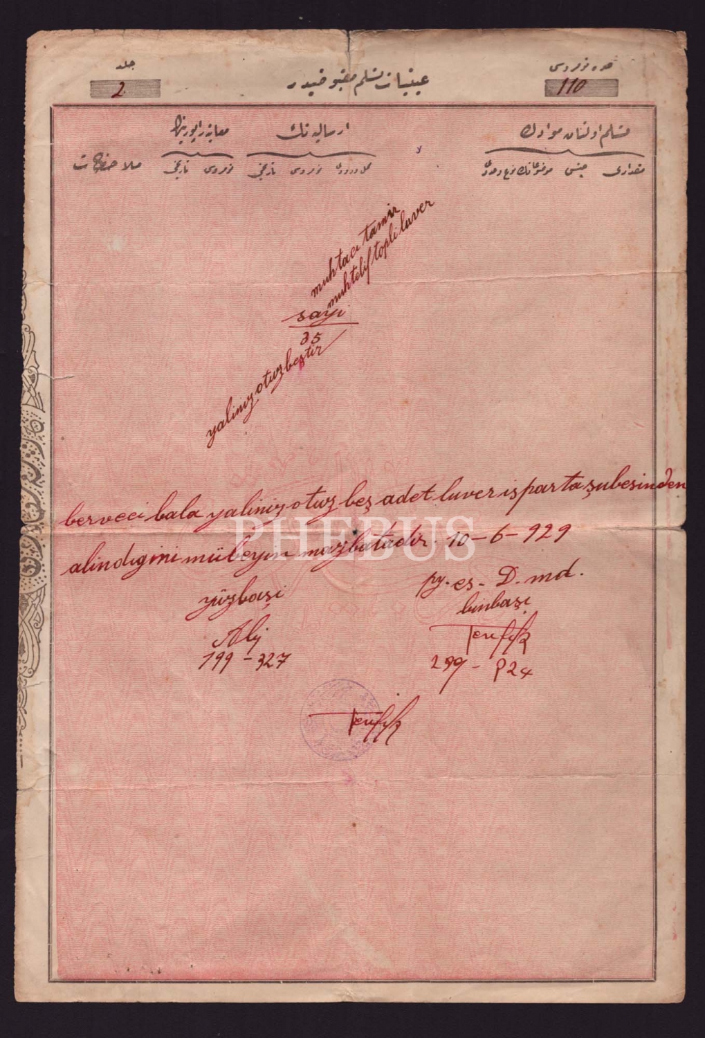 Tamir edilmesi gereken otuz beş adet "Toplu Lüver" tabancanın Isparta Şubesi´nden teslim alındığına dair, Yüzbaşı Ali Efendi ile Binbaşı Tevfik Efendi´nin imzalarını taşıyan ayniyat teslim makbuzu, 10 Haziran 1929, 24x35 cm...