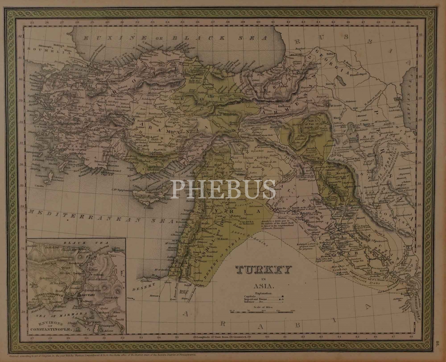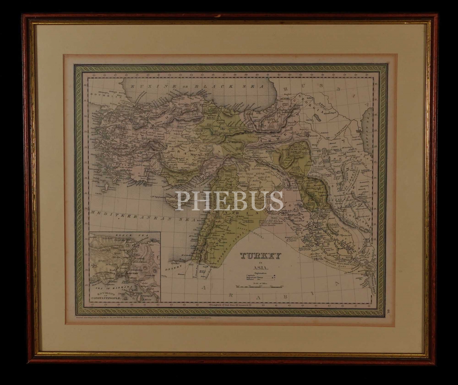 Türkiye´nin Asya´daki topraklarını gösteren 1850 tarihli, elle renklendirilmiş harita, "Turkey in Asia", çerçevesiyle birlikte 50x43 cm...