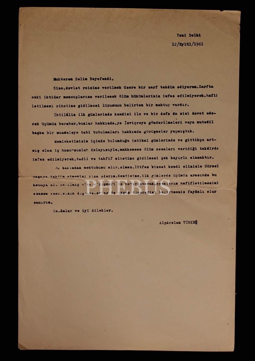 12 Eylül 1961 tarihli iki adet mektup suretinden ilki, "Muhterem Selim Beyefendi" hitabıyla başlamaktadır. Mektupta, sabık iktidar mensuplarının infaz cezalarının hafifletilmesi ve ihtilalin ilk günlerinde kararlaştırıldığı gibi İsviçre'ye gönderilmeleri tavsiye edilmiş; aksi takdirde memleketin iç huzursuzluğunun artacağına dikkat çekilmiştir.