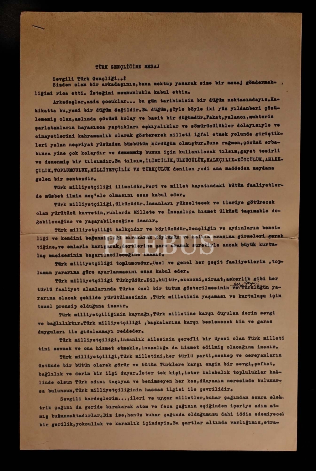 Lot içerisinde yer alan "Türk Gençliğine Mesaj" başlıklı metin sureti ise, Türkeş'in ilk paragrafta belirttiği gibi bir gencin kendisine mektup yazarak kendilerine bir mesaj göndermesini rica etmesi sonucu kaleme dökülmüştür. Türk milliyetçiliğine dair detaylı açıklamalara yer verilen metin, "Ey kahraman çocuklar! Size diş gösteren, saldıran, hakaret eden inançsız kara ruhlulara aldırmadan ileriye atılınız... Ülkü ve heyecan dolu temiz ruhlarınızdan güneşler doğacaktır! Yarınlar sizindir... Başarı, mutluluk ve selâm sizlere..." ifadeleriyle noktalanmaktadır.