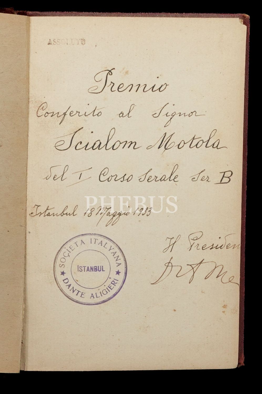 "Soçieta İtalyana Dante Aligieri İstanbul" mühürlü ve 1933 tarihli italyanca bir yazı ve yazara ait olmayan imza...