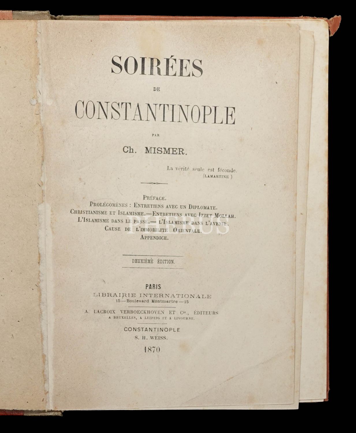 SOIREES DE CONSTANTINOPLE, Charles Mismer, 1870, Paris - Constantinople: Librairie Internationale; A. Lacroix Verboeckhoven et Cie., & S.H. Weiss,, Typographie et Lithographie Centrales Constantnople, 380 sayfa, 14x20 cm...