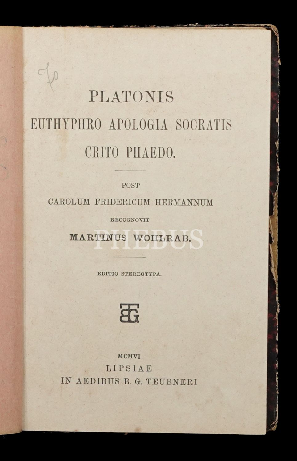PLATONIS EUTHYPHRO APOLOGIA SOCRATIS CRITO PHAEDO, Martinus Wohlrab-Carolum Fridericum Hermannum,1890 in aedibus B. G. Teubneri Lipsiae,174 sayfa, 12x18 cm...