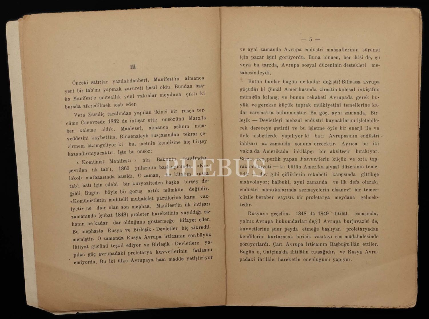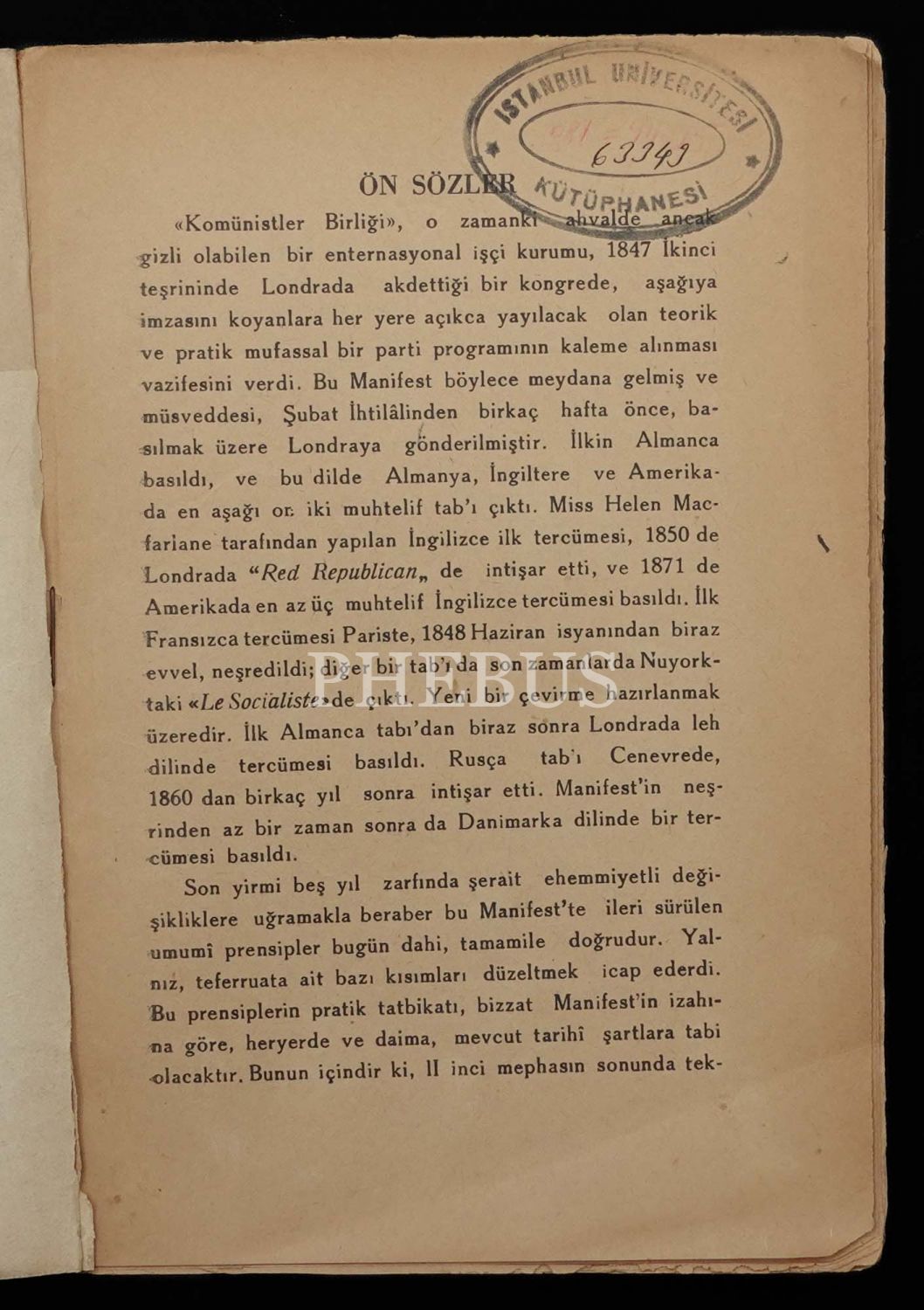 Mustafa Suphi'nin yarım bıraktığı ve Şefik Hüsnü'nün tamamlayarak 1923 yılında "Komünist Beyannamesi" adıyla, eski harflerle yayımladığı ilk Manifesto çevirisinden sonra; Kerim Sadi'nin Latin harfleriyle ve Engels'in önsözleriyle "tam tercüme" olarak yayımladığı Komünist Manifesto çevirisi... Yayımlandığı yıl Bakanlar Kurulu kararıyla yasaklanarak toplatılan çeviri, yeni bir çevirinin yapılacağı 1968 yılına kadar yasak yayınlar listesinde yer aldı. Yaklaşık 90 yıldan bu yana, illegal olarak elden ele dolaşmış, en gizli zulalarda saklanmış, nice toplatmaları, aramaları atlatabilmiş, fevkalade nadir bir nüsha...