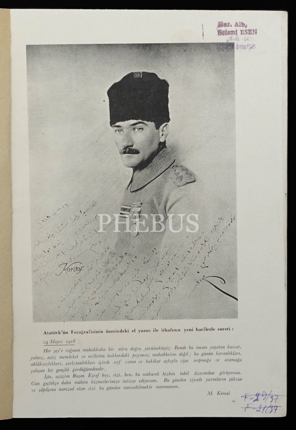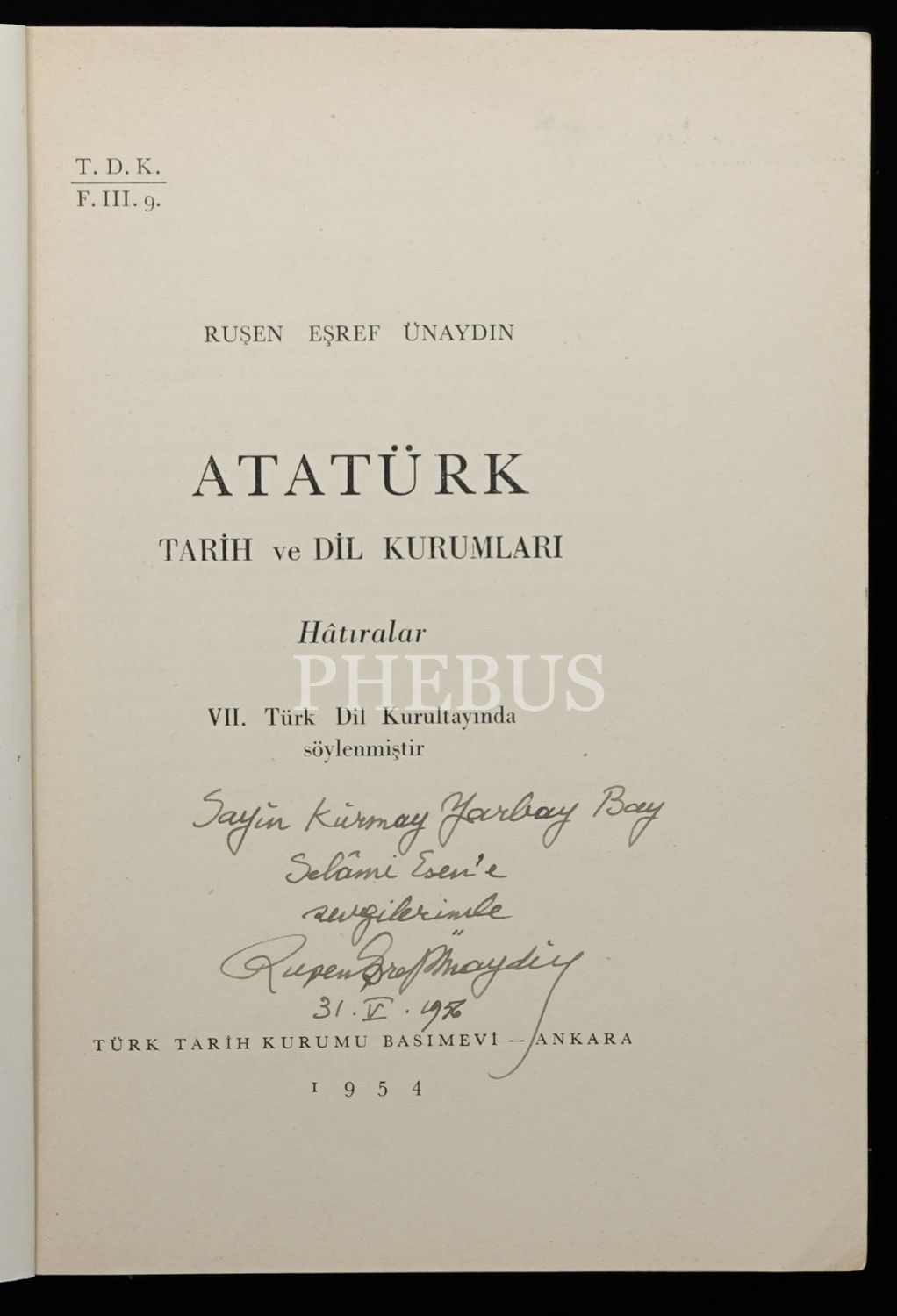 Henüz kimsenin tanımadığı bir subayken, Anafartalar Grup Komutanlığı esnasındaki büyük başarıları vesilesiyle Mustafa Kemal ile ilk mülakatı gerçekleştirerek onu kamuoyuna tanıtan Ruşen Eşref Ünaydın´ın Türk Dil ve Türk Tarih kurumları ile ilgili hatıraları... "Sayın Kurmay Yarbay Bay Selâmi Esen´e sevgilerimle" ithafıyla imzalı... Kitabın künye sayfasından önce kuşe kâğıda basılı, Atatürk´ün 1918 tarihli Ruşen Eşref Ünaydın´a takdir ve teşekkür içeren imzalı bir fotoğrafı mevcuttur.