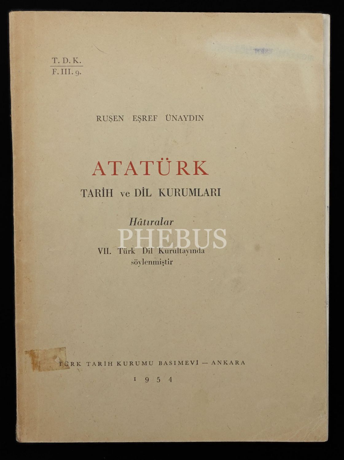 ATATÜRK TARİH VE DİL KURUMLARI, Ruşen Eşref Ünaydın, 1954, Türk Tarih Kurumu Basımevi, 70 sayfa, 18x24 cm...