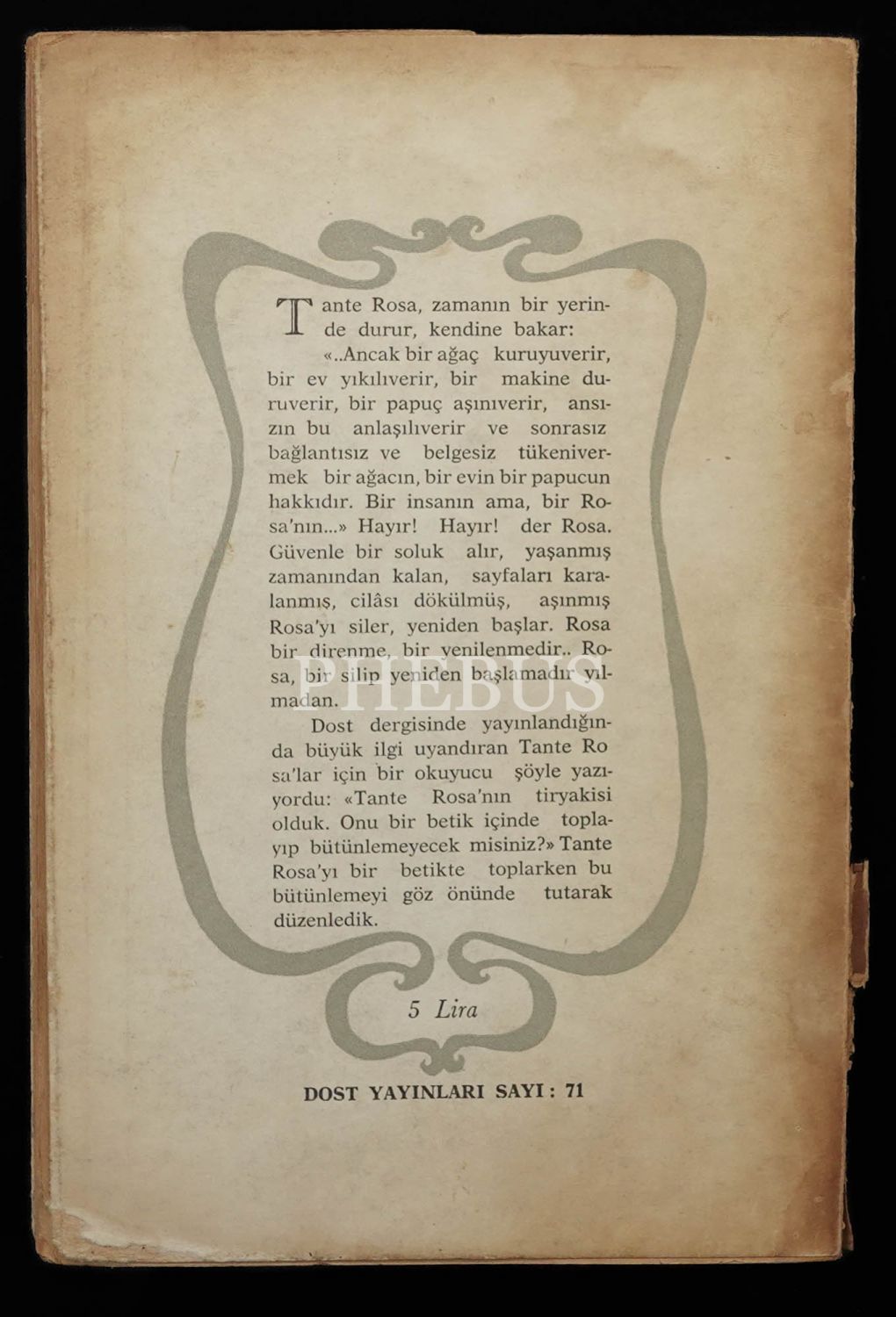 Türk edebiyatının en büyük "erken" kayıplarından Sevgi Soysal´ın modern bir klasik olan eseri Tante Rosa'nın ilk basımı... Türk edebiyatının en sahici ve en cesur eleştirmenlerinden Fethi Naciye imzalı...