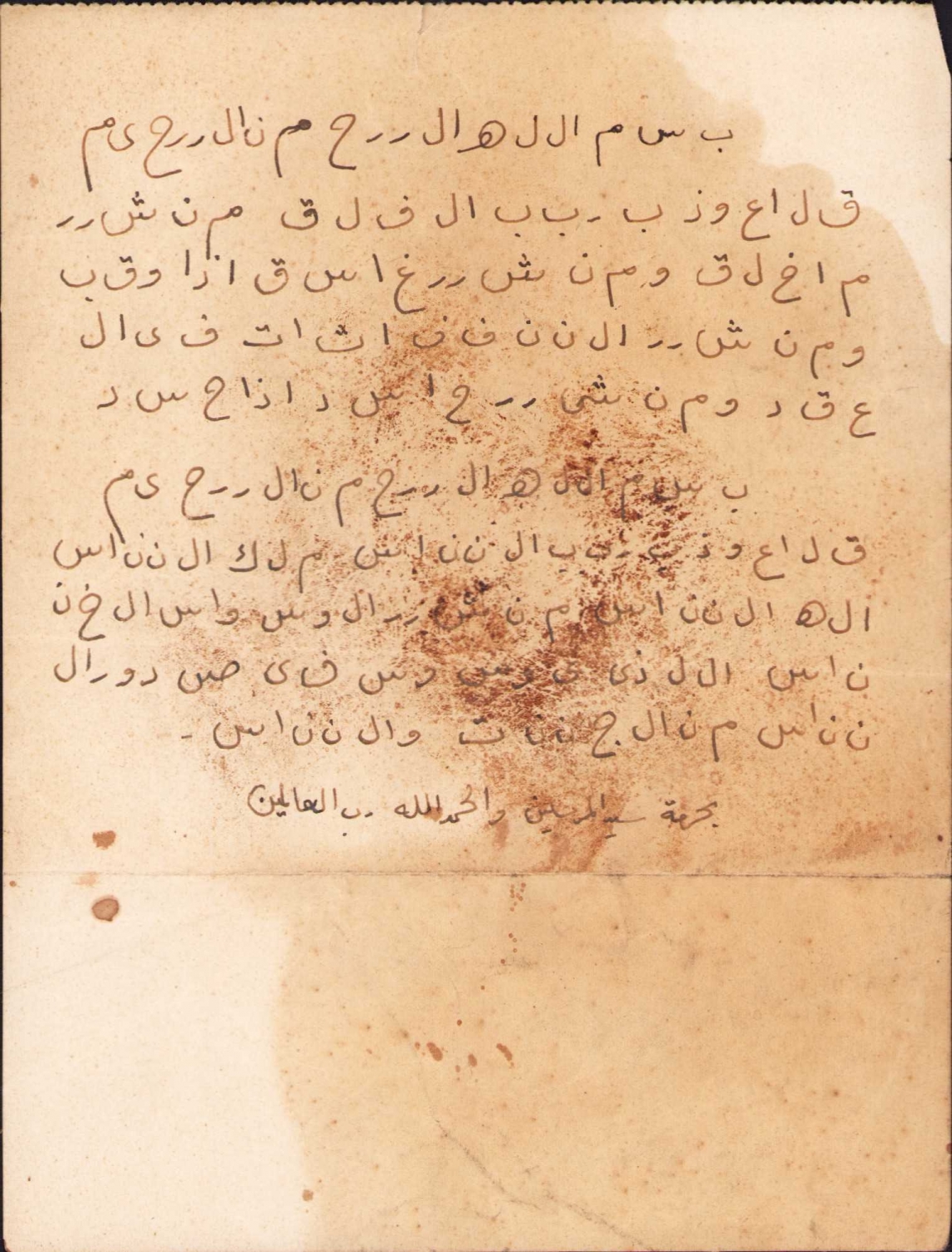 Birleştirilmemiş harflerle yazılmış 'Felak' ve 'Nas' sureleri, haliyle, Arapça, 13x17 cm.