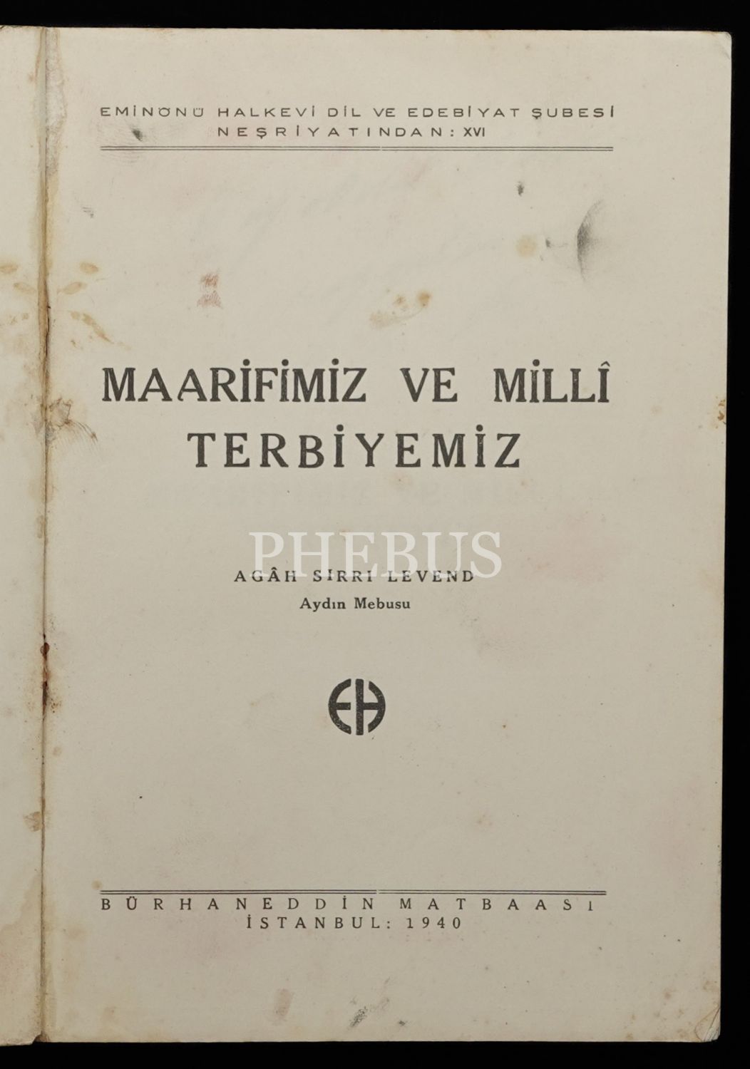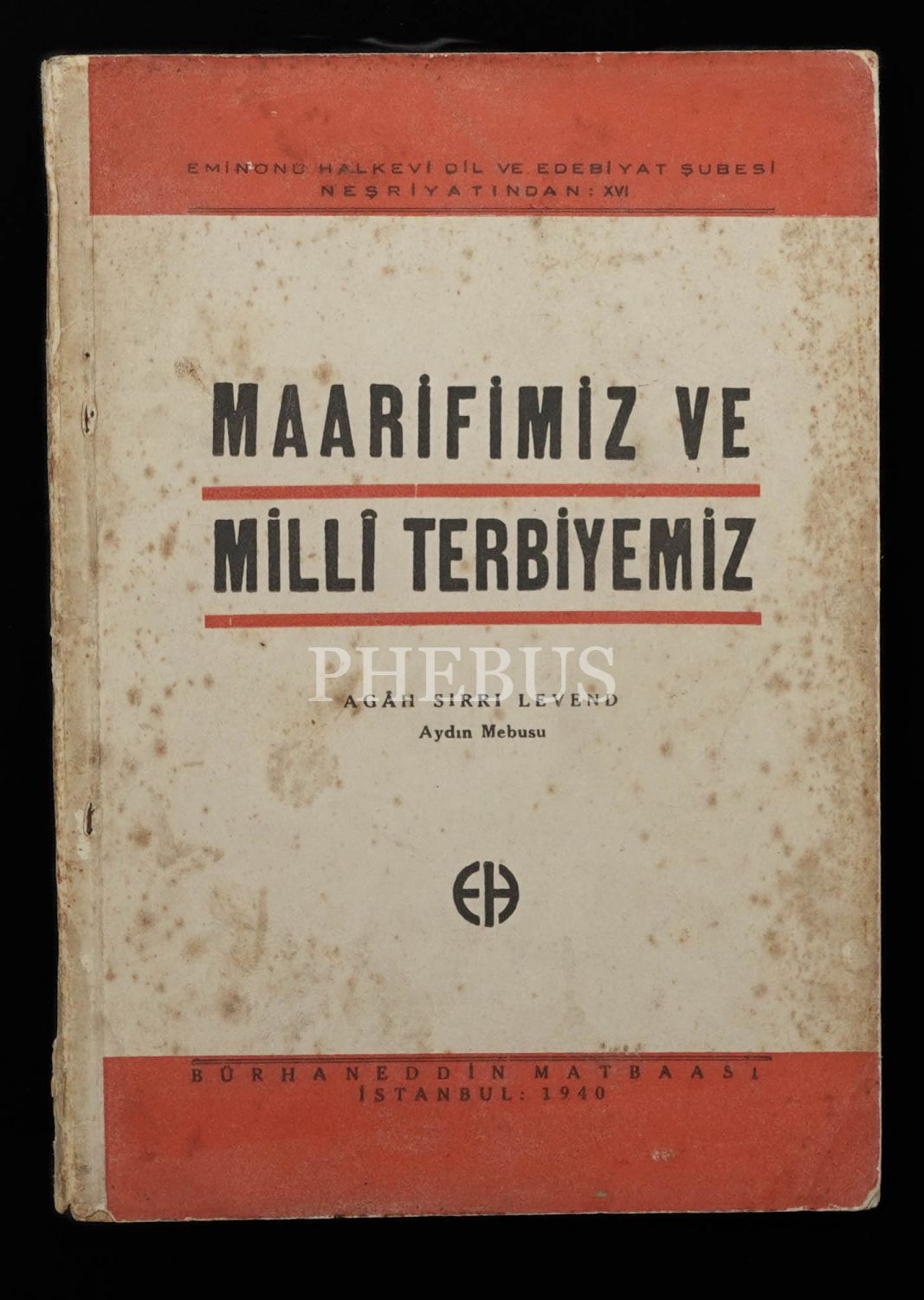 MAARİFİMİZ VE MİLLÎ TERBİYEMİZ, Agâh Sırrı Levend, 1940, Eminönü Halkevi Dil ve Edebiyat Şubesi Neşriyatından-Bürhaneddin Matbaası, 106 sayfa, 14x20 cm...