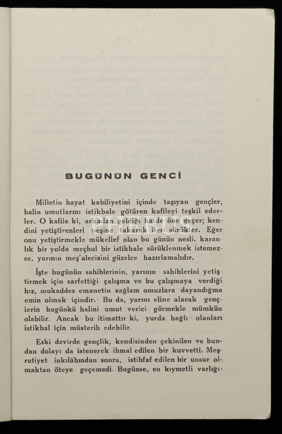 Edebiyat tarihçiliği ve dilciliği yanı sıra, biyografi çalışmalarıyla da Türk edebiyatına büyük katkılar sağlamış olan Prof. Agâh Sırrı Levend (1894 - 1978), bu eserinde gençlik ve eğitim sorunları üzerinde duruyor.