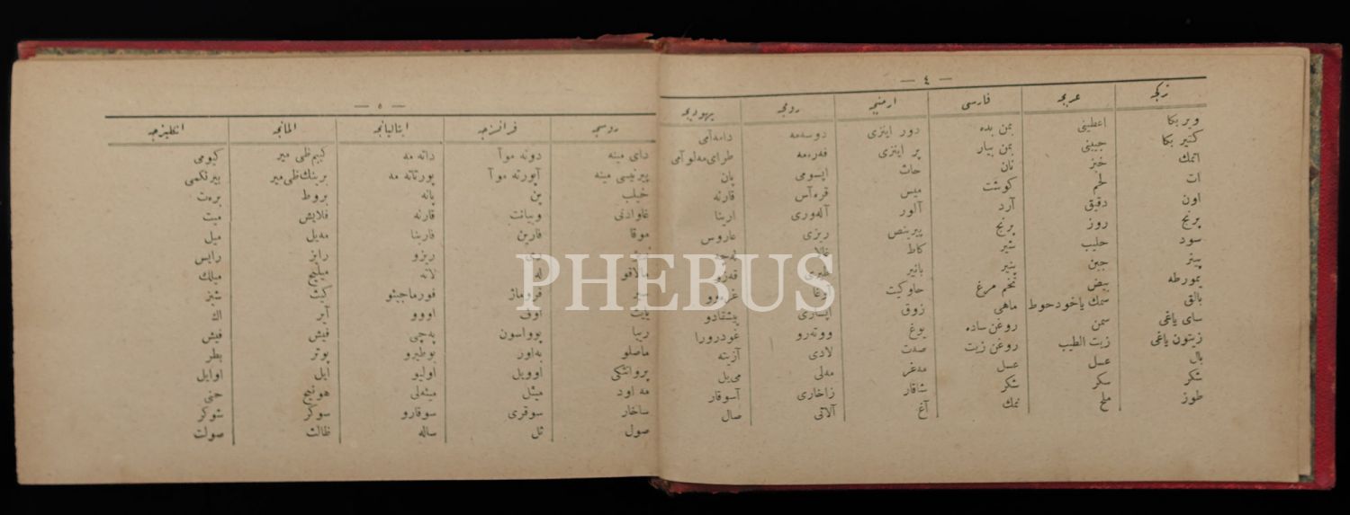 Kaynak dil Türkçe üzerinden çok dilli bir sözlük çalışması... Üç bölümden oluşan eserin birinci bölümü kelimelere, ikinci bölümü gramere, üçüncü bölümü de diyaloglara ayrılmıştır. *Döneminin deri sırtlı cildi içinde…