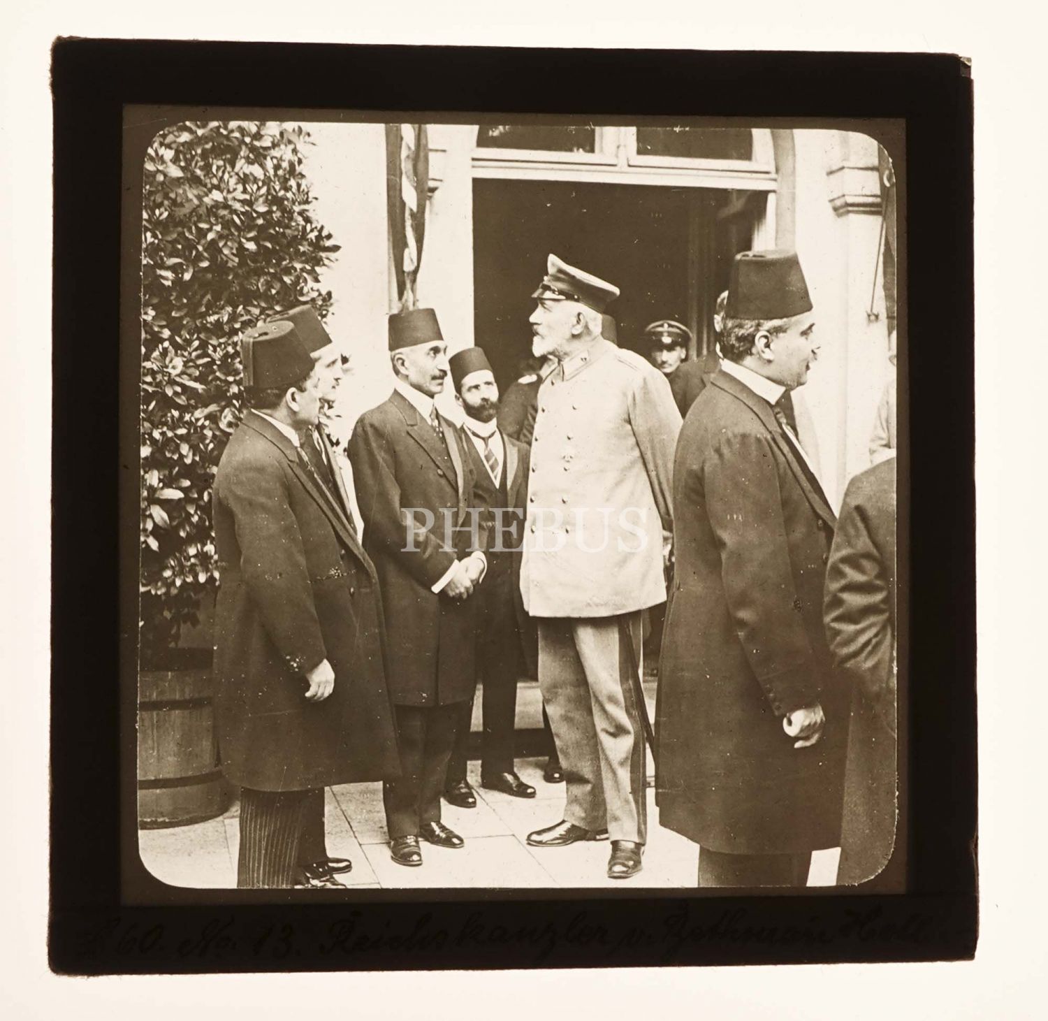 Cihan Harbi yıllarının Alman Şansölyesi Theobald von Bethmann Hollweg´in Osmanlı heyetiyle birlikte görüldüğü pozitif cam slayt, 9x9 cm...