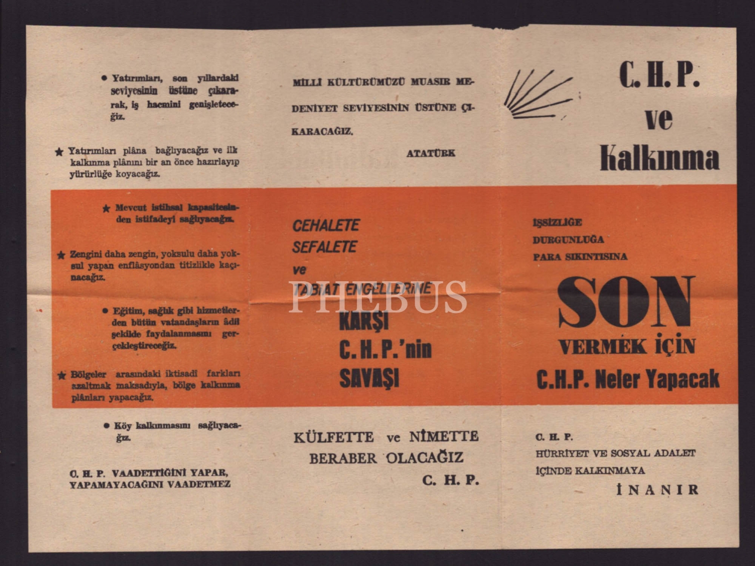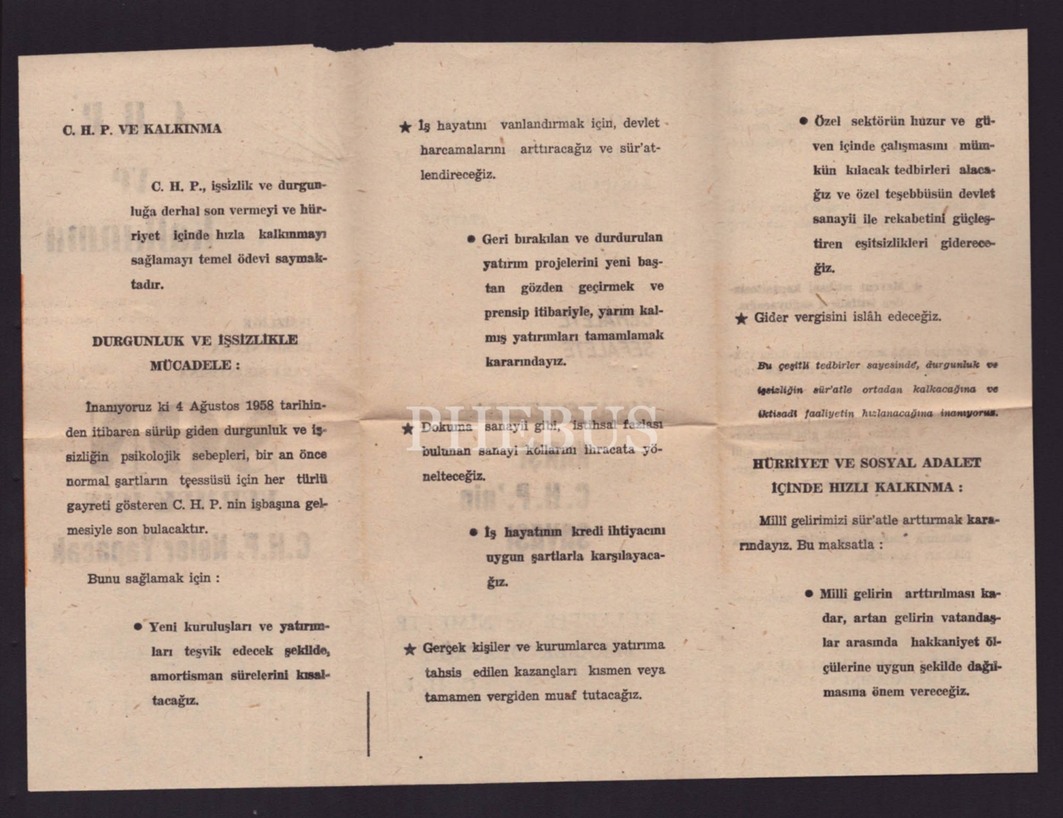 Özet içerisinde "İşsizliğie Durgunluğa Para Sıkıntısına Son Vermek İçin C.H.P. Neler Yapacak" başlıklı bir broşür yer almaktadır.