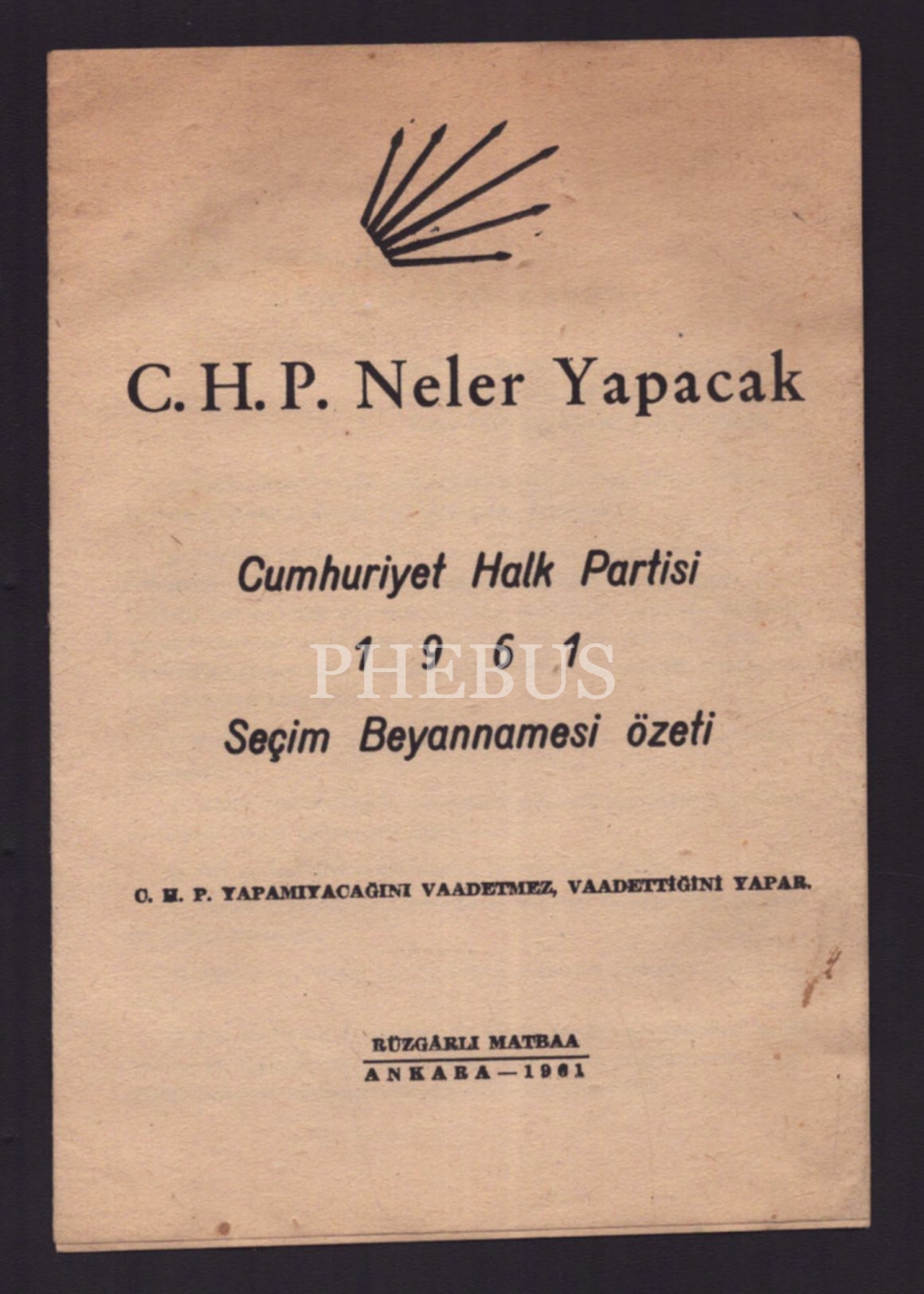 "C.H.P NELER YAPACAK" başlıklı, Cumhuriyet Halk Partisi 1961 Seçim Beyannamesi Özeti, Rüzgârlı Matbaa, 12 sayfa, 13x19 cm...