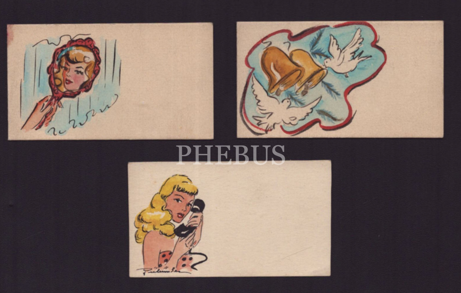 Gülümser Aral´ın orijinal çizim desen ve figürleriyle üç adet kartvizit boy bayram tebrik kartı, 9x5 cm...
