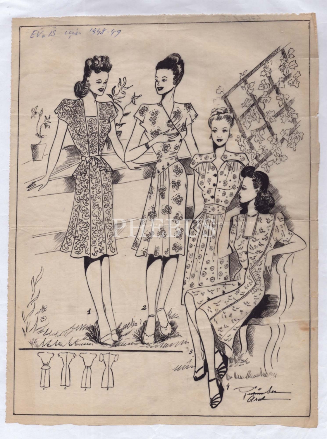 Gülümser Aral´ın Ev-İş dergisi için hazırladığı ıslak imzalı kıyafet çizimi, 1948-49 tarihli, 25x33 cm...