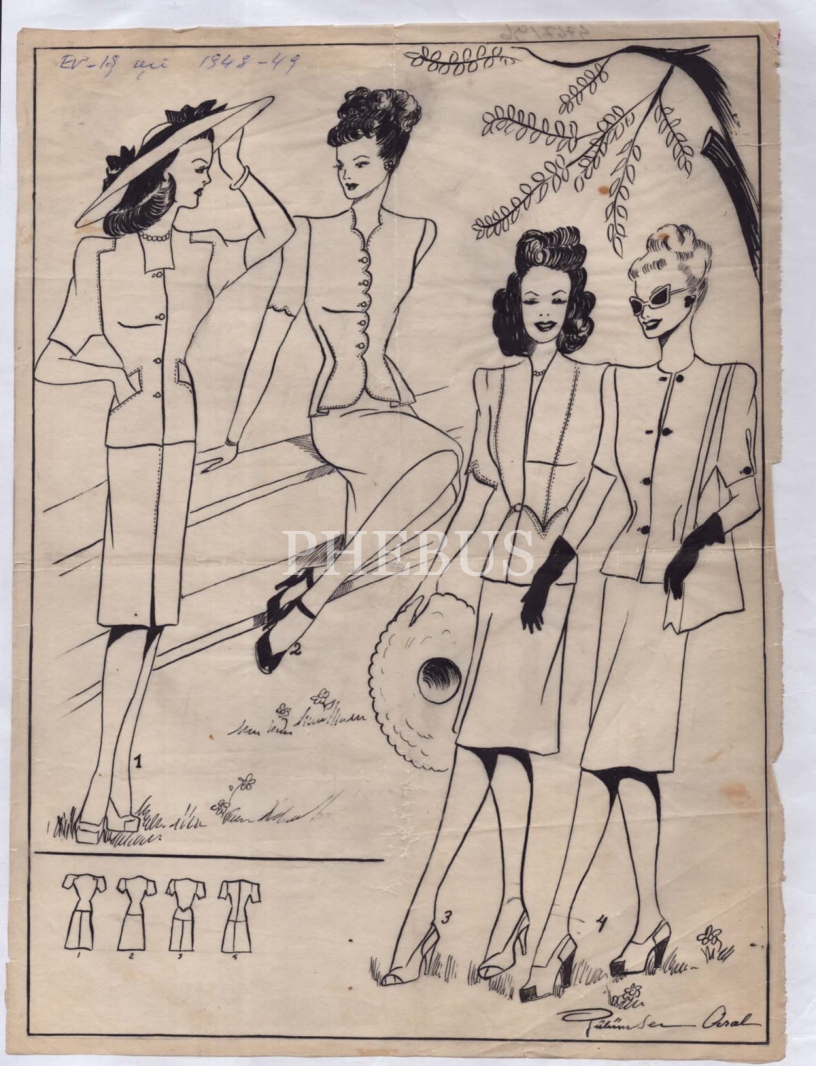 Gülümser Aral´ın Ev-İş dergisi için hazırladığı ıslak imzalı moda çizimi, 1948-49 tarihli, 25x33 cm...