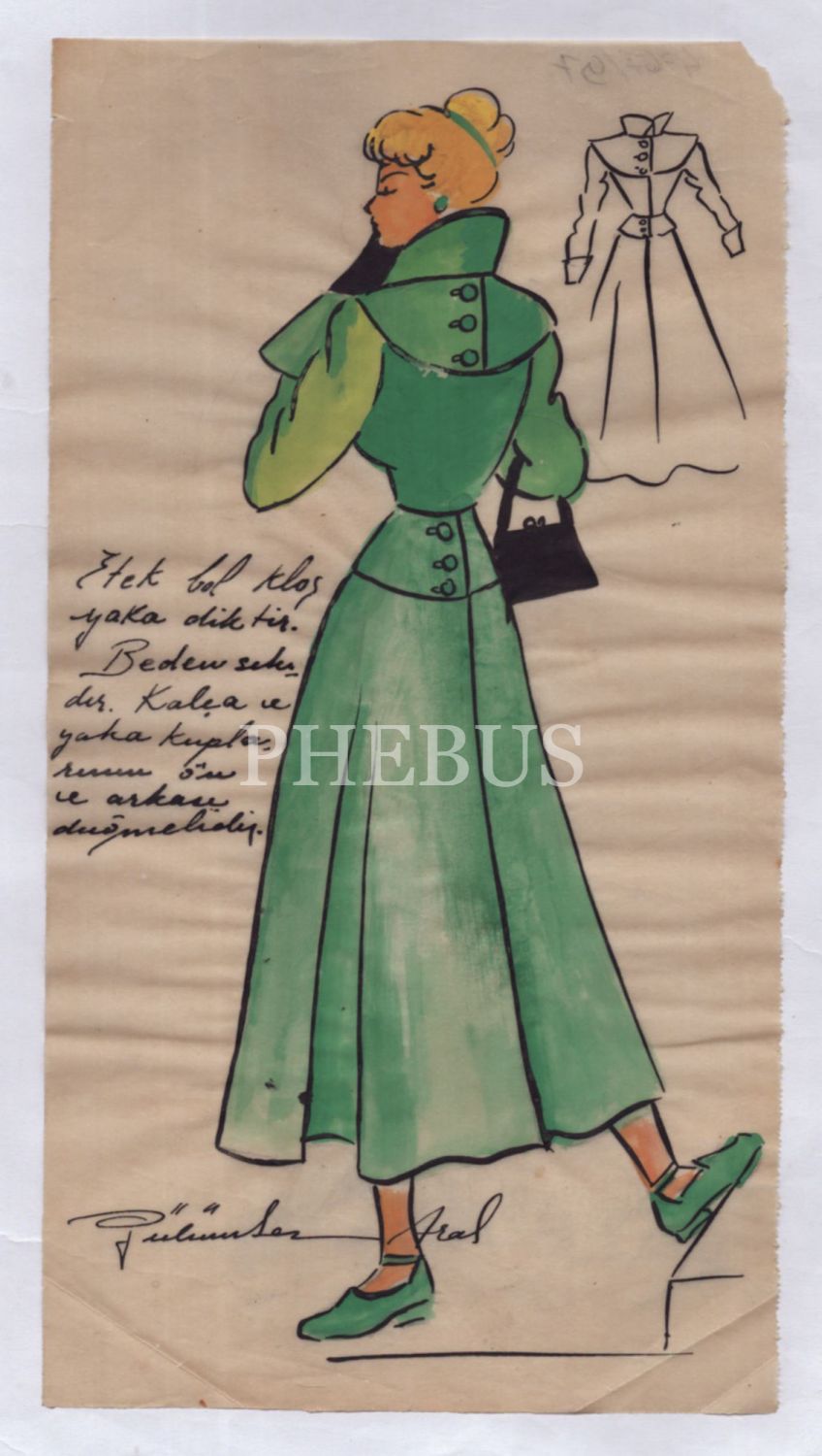 Gülümser Aral´ın ıslak imzalı ve el yazısı tarifli kıyafet çizimi, 14z27 cm...