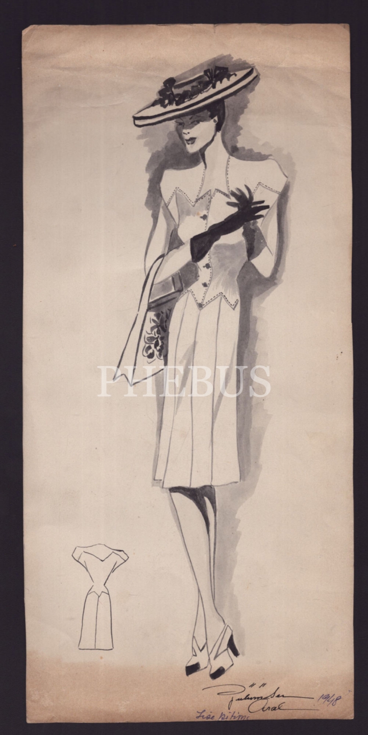 Gülümser Aral´ın ıslak imzalı, 1948 tarihli kıyafet çizimi, 18x38 cm...