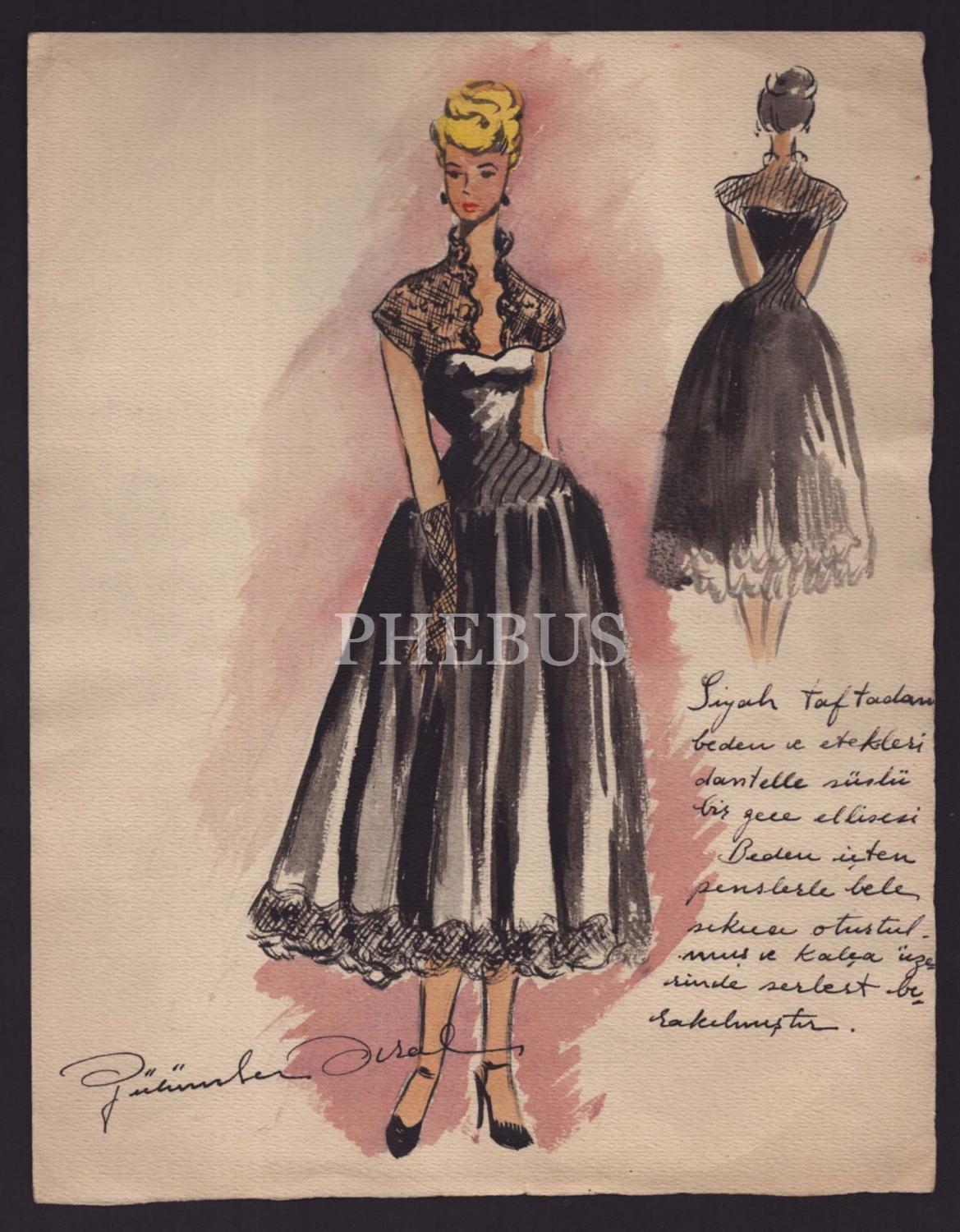 Gülümser Aral´ın ıslak imzalı ve el yazısı tarifli kıyafet çizimi, 25x32 cm...