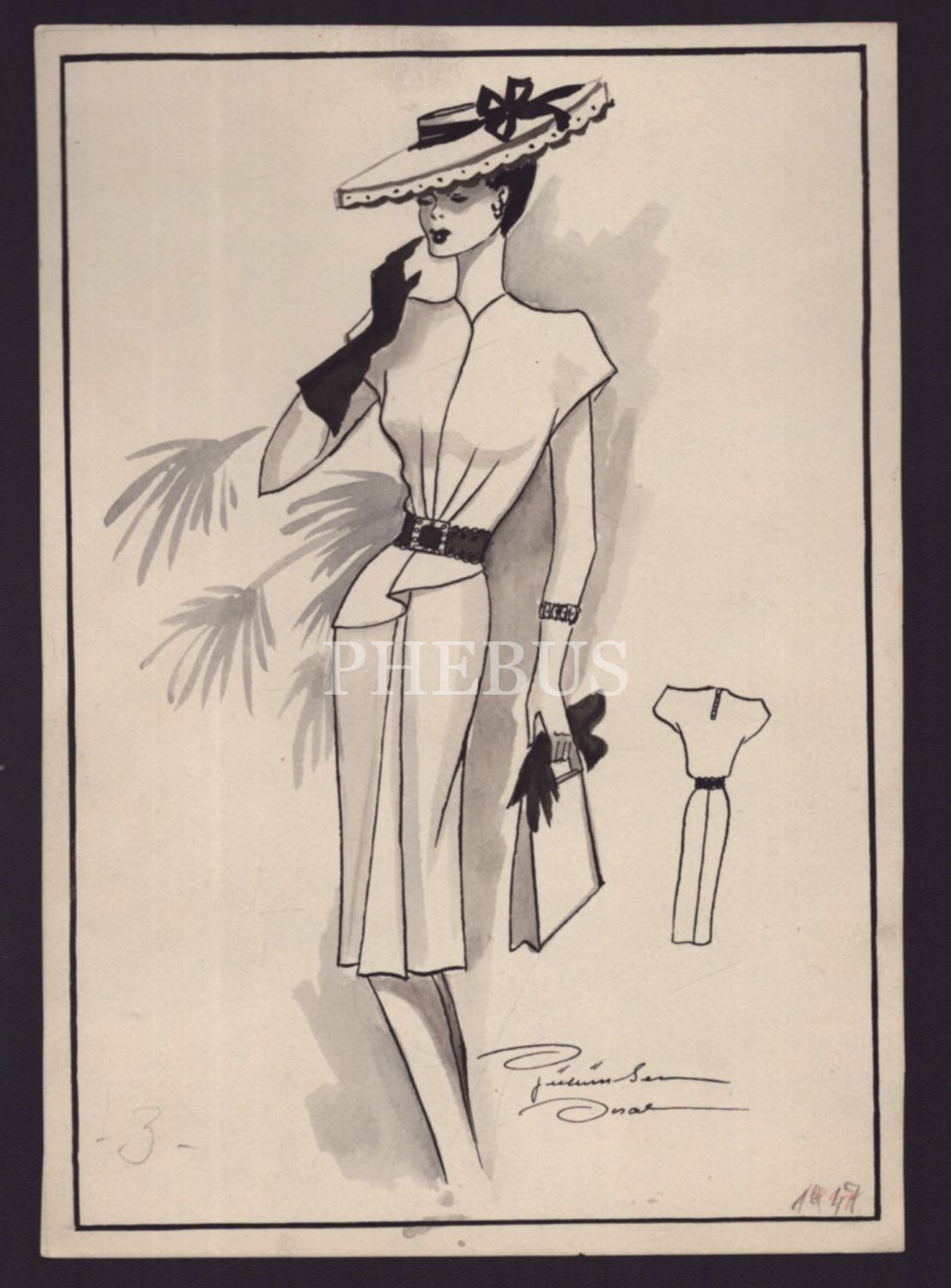 Gülümser Aral´ın ıslak imzalı, 1947 tarihli kıyafet çizimi, 15x22 cm...