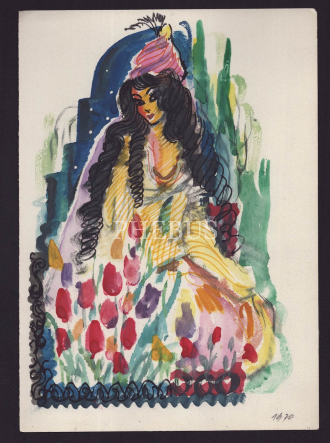 Gülümser Aral´ın 1970 tarihli, laleler ve kadın temalı çizimi, 17x24 cm...
