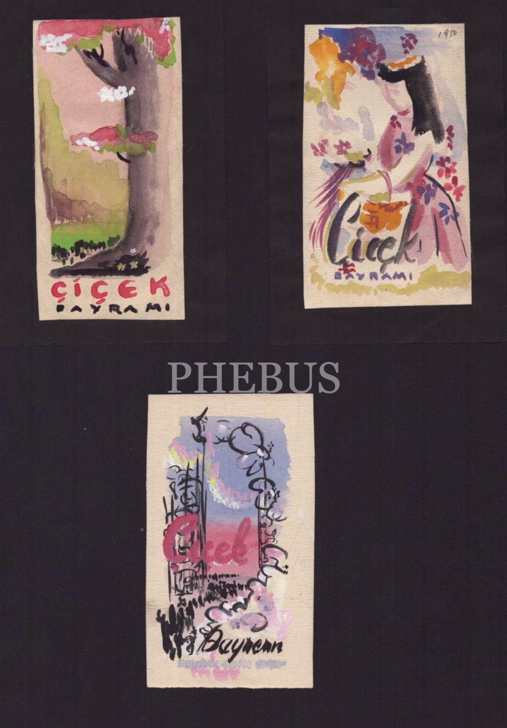 Gülümser Aral´ın "Çiçek Bayramı" konulu, 1950 tarihli üç adet çizimi, ortalama 7x13 cm...