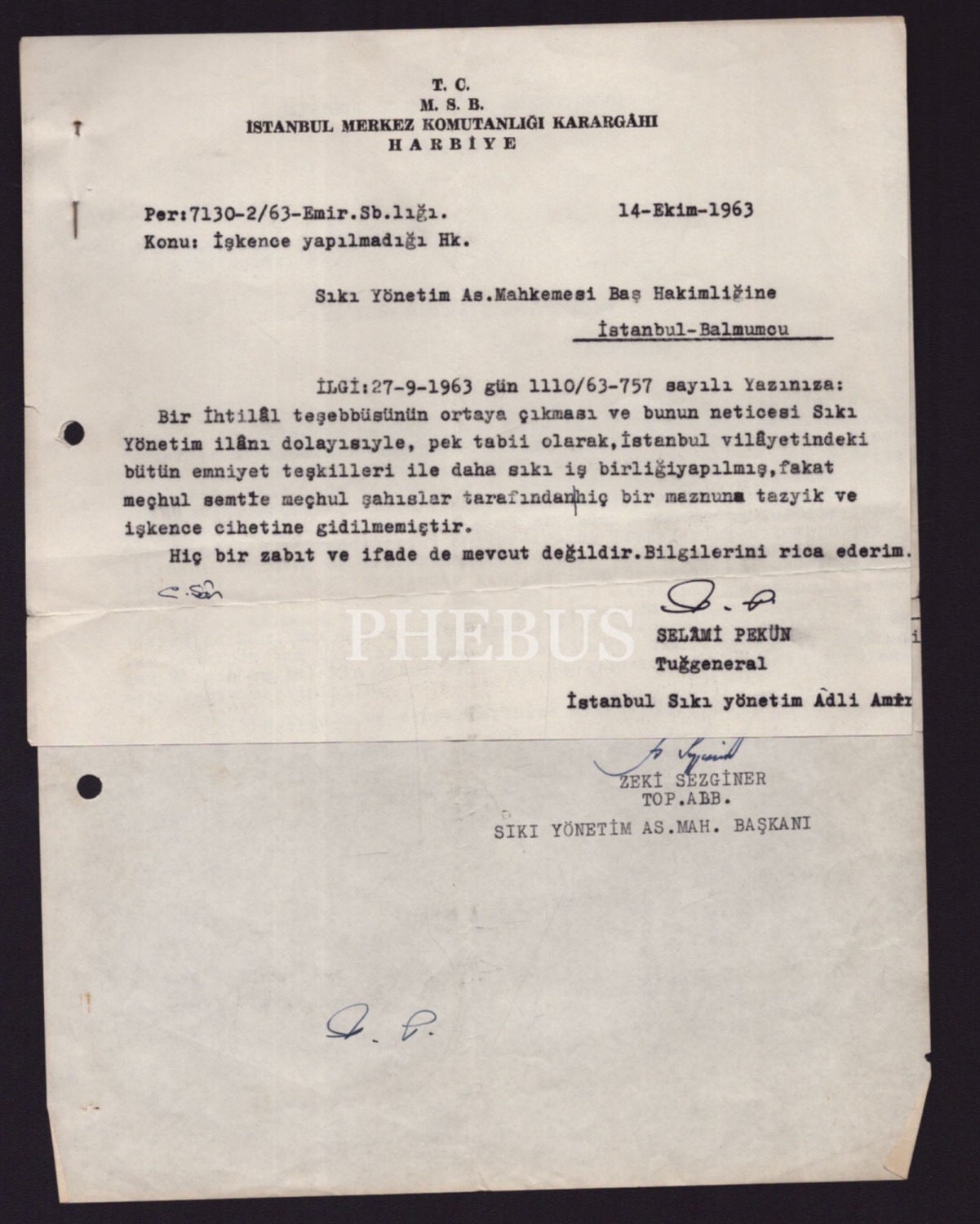 Tuğgeneral Selami Pekün´ün, Sıkıyönetim Askeri Mahkemesi Baş Hakimliğine hitaben kaleme aldığı cevap: "Bir ihtilâl teşebbüsünün ortaya çıkması ve bunun neticesi Sıkı Yönetim ilânı dolayısıyle, pek tabii olarak, İstanbul vilâyetindeki bütün emniyet teşkilleri ile daha sıkı iş birliği yapılmış, fakat meçhul semtte meçhul şahıslar tarafından hiç bir maznuna (sanığa) tazyik ve işkence cihetine gidilmemiştir. Hiç bir zabıt ve ifade de mevcut değildir. Bilgilerini rica ederim."