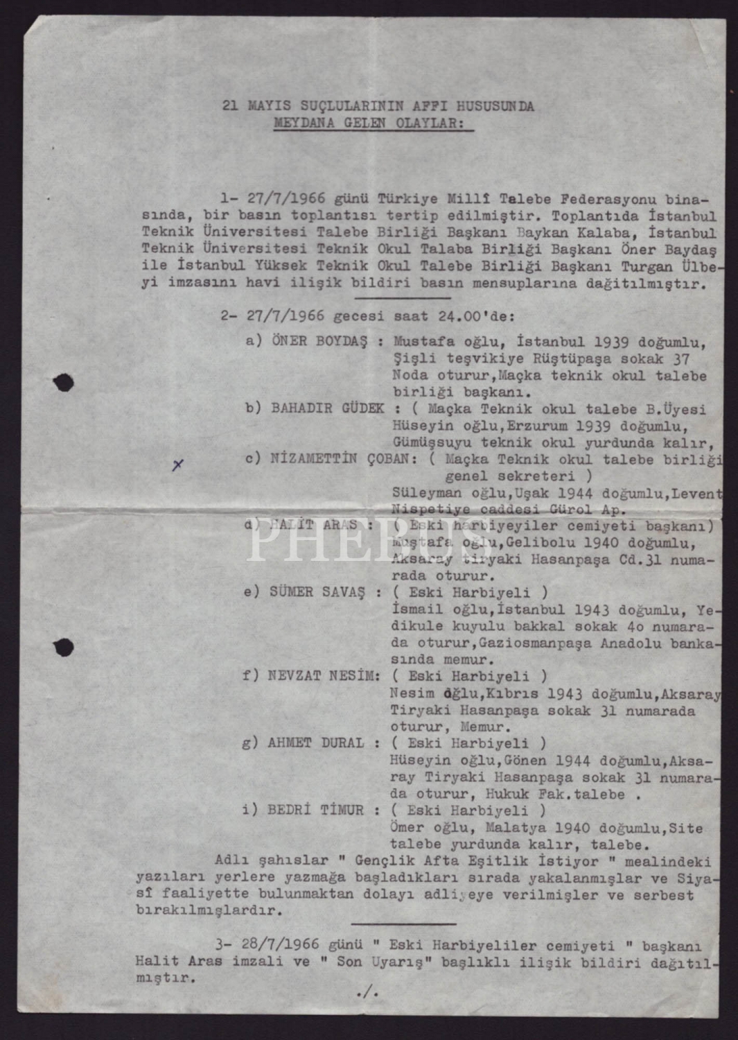 "21 Mayıs Suçlularının Affı Hususunda Meydana Gelen Olaylar" başlıklı 3 yapraklık rapor, 30x21 cm...
