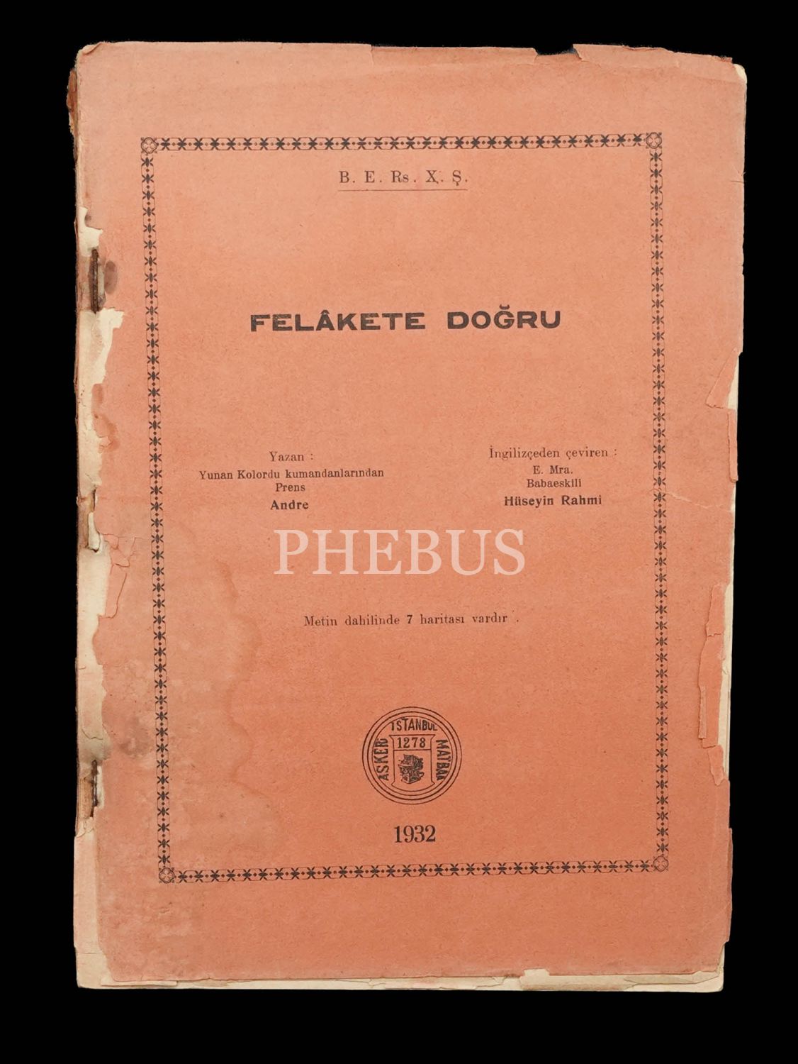 FELÂKETE DOĞRU, yazan: Yunan Kolordu kumandanlarından Prens Andre, çeviren: Babaeskili Hüseyin Rahmi, 1932, 191 sayfa, 19x26 cm...