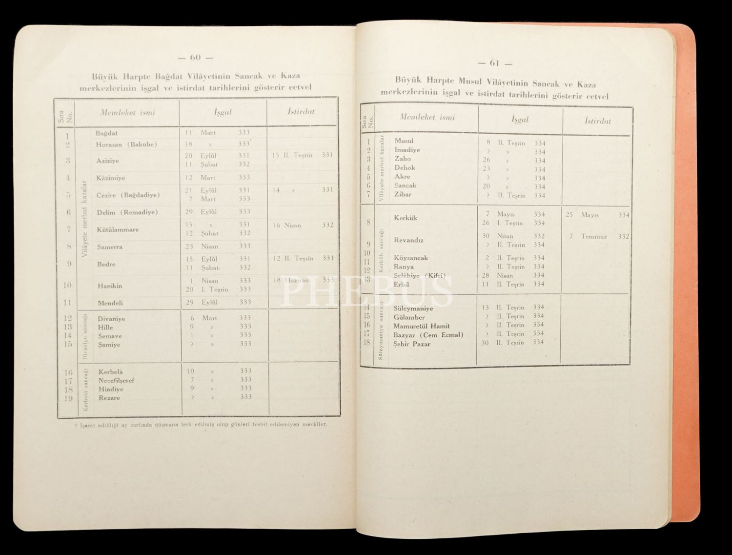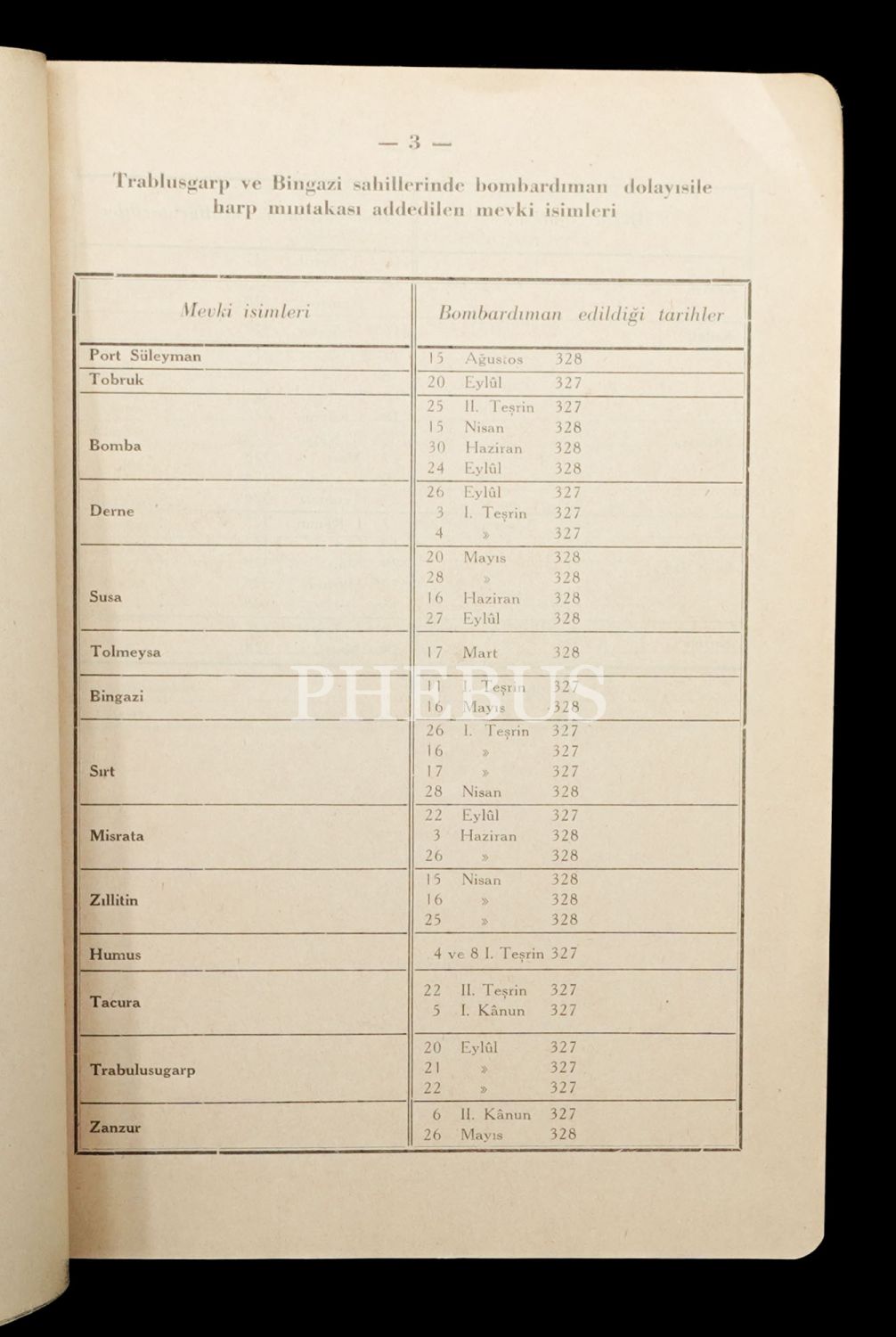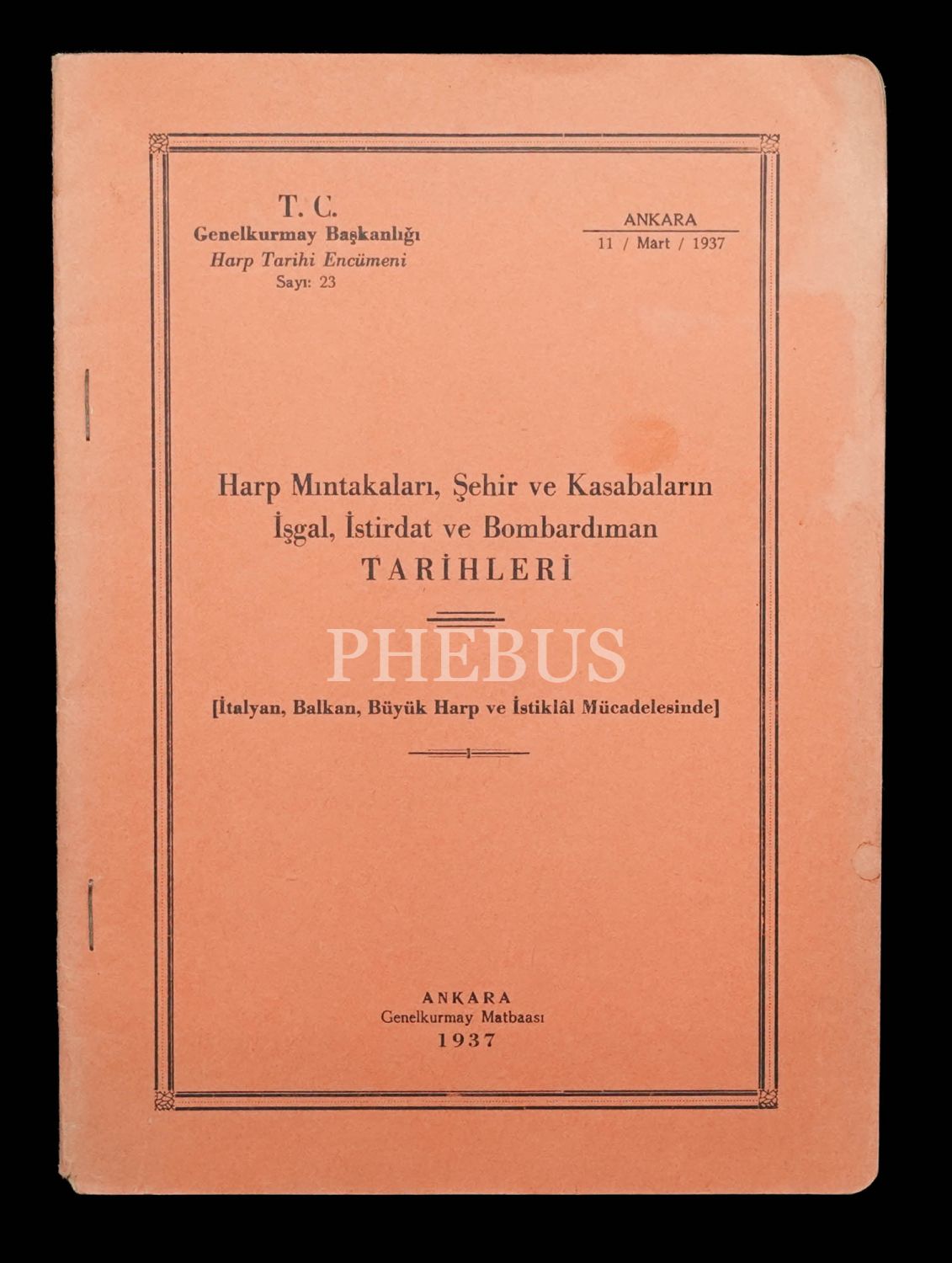 HARP MINTIKALARI, ŞEHİR VE KASABALARIN İŞGAL, İSTİRDAT VE BOMBARDIMAN TARİHLERİ (İtalyan, Balkan, Büyük Harp ve İstiklâl Mücadelesinde), 1937, Genelkurmay Matbaası, 80 sayfa, 19x27 cm...