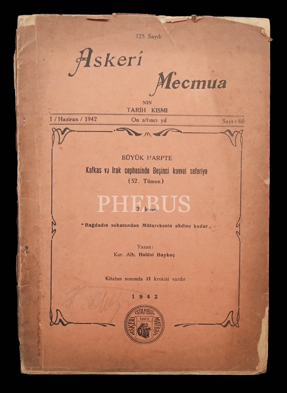 BÜYÜK HARPTE KAFKAS VE IRAK CEPHESİNDE BEŞİNCİ KUVVAİ SEFERİYE (52. Tümen) - 2. Kısım, Hulûsi Baykoç, 1942, 85 sayfa, 19x27 cm...