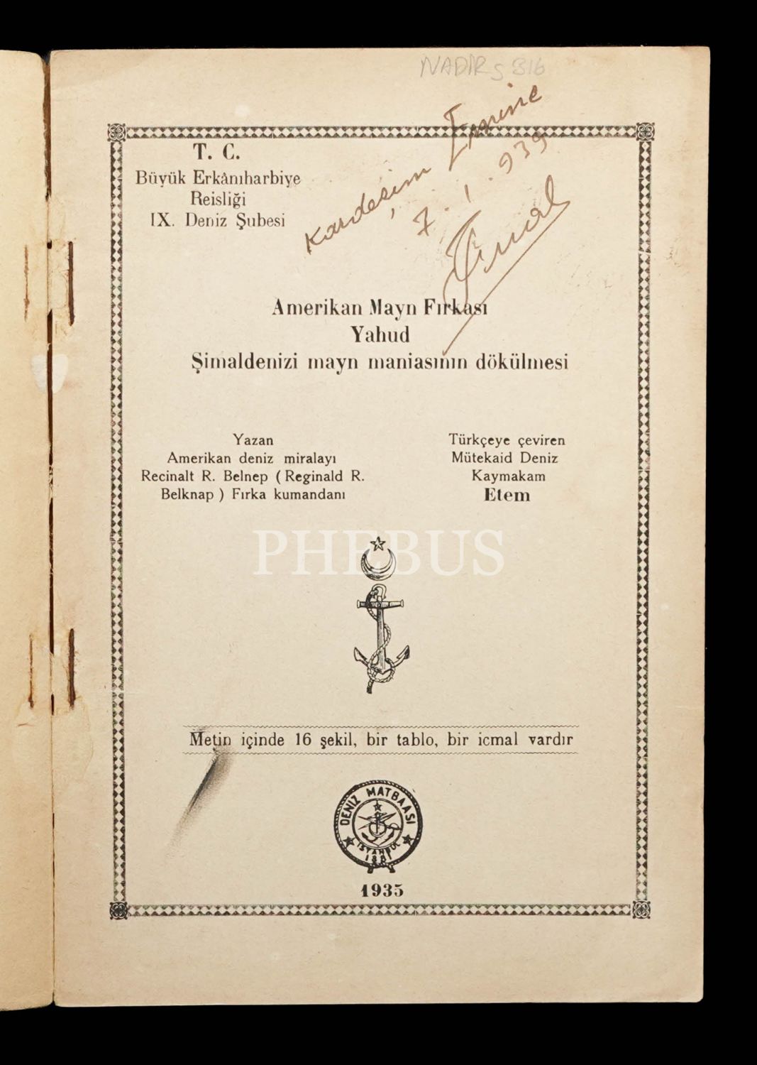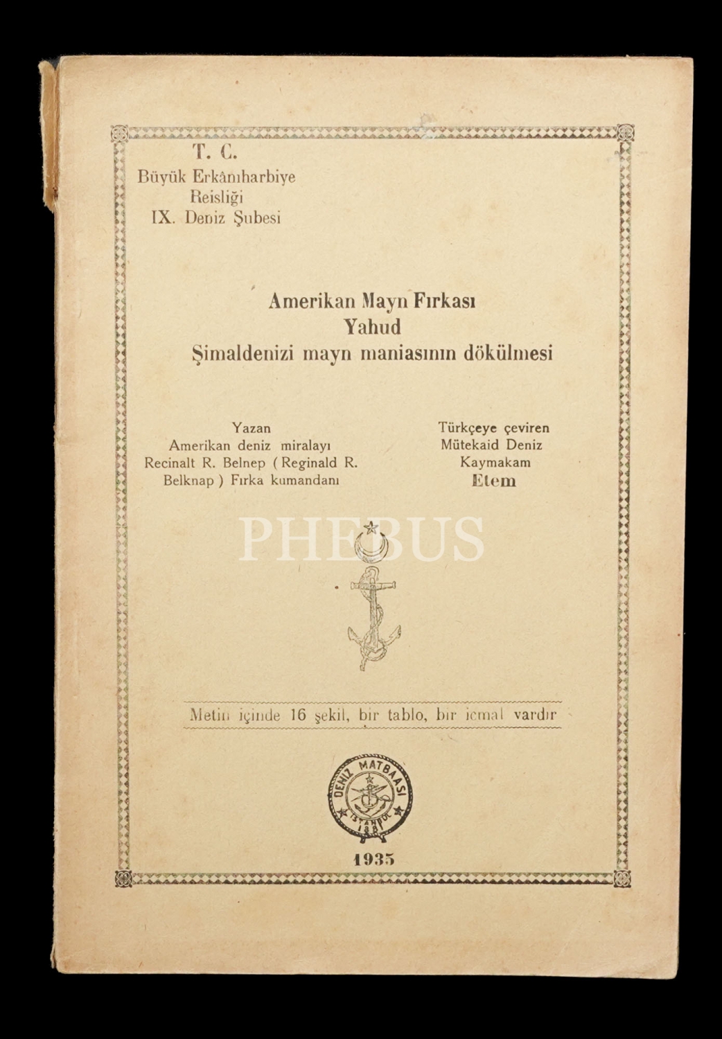 AMERİKAN MAYN FIRKASI YAHUD ŞİMALDENİZİ MAYN MANİASININ DÖKÜLMESİ, yazan: Amerikan Deniz Miralayı Recinalt R. Belnep, çeviren: Mütekaid Deniz Kaymakam Etem, 1935, Deniz Matbaası, 117 sayfa, 17x24 cm...