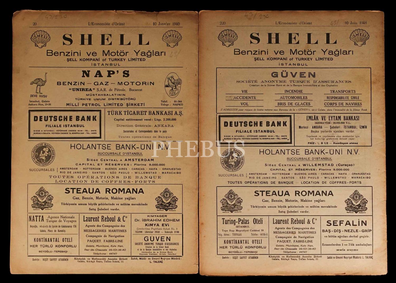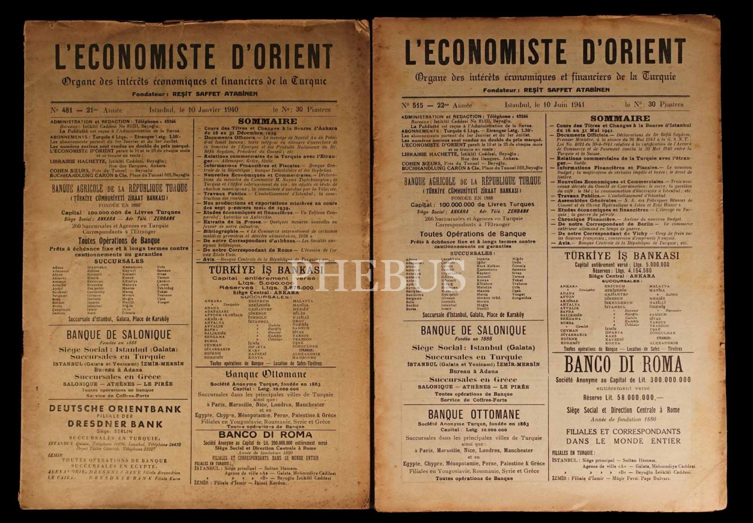 Reşit Saffet Atabinen tarafından çıkarılan L´ECONOMISTE D´ORIENT dergisinin 481. (10 Ocak 1940) ve 515. (10 Haziran 1941) sayıları, 23x32 cm...