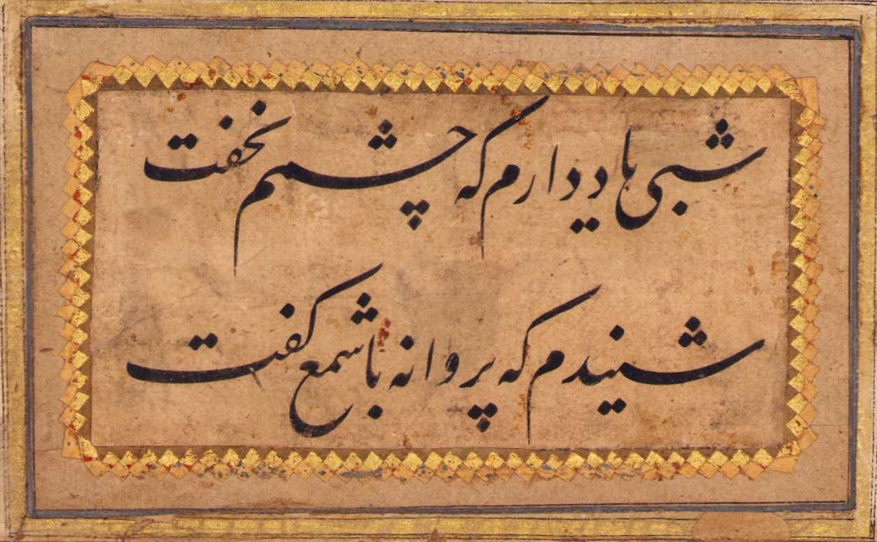 Hoca işi talik yazı, Farsça beyit, tezhipli, 10x5 cm.