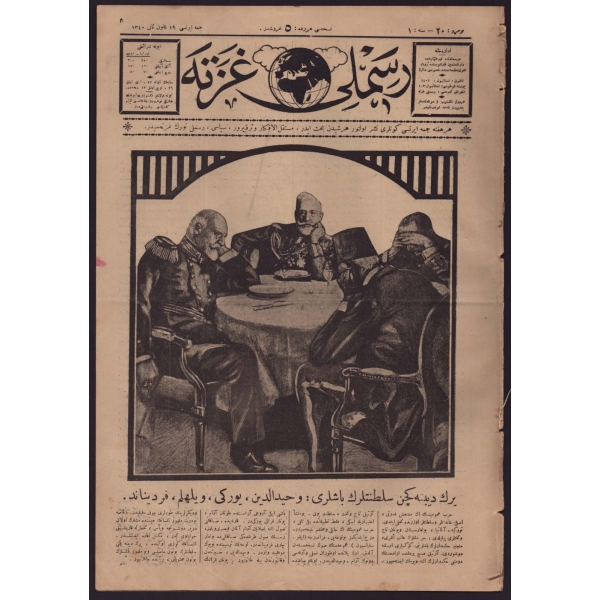 "Yerin dibine geçen saltanatların başları: Vahdeddin, Yorgi, Vilhelm, Ferdinand" manşetiyle, bir masa etrafında toplanan İttifak devletleri liderlerinin düşünceli ve bitkin bir halde görüldüğü çizimi kapağına taşıyan RESİMLİ GAZETE´nin 19 Kanunisani 1340 tarihli 20. sayısı, 8 sayfa, 28x39 cm...